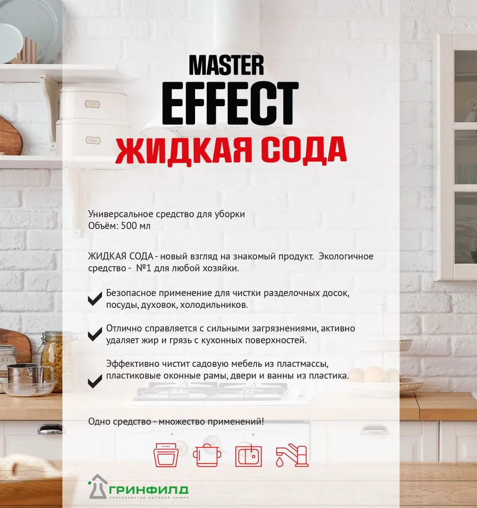 Master Effect Сода жидкаяудаляет жир слабый запах ломкая ручка плохое качество В данный момент этот товар отсутствует в продаже. Возможно, у нас найдется аналогичный или похожий товар здесь. Экологичное средство № 1 для любой хозяйки. Новый взгляд на знакомый продукт. |
