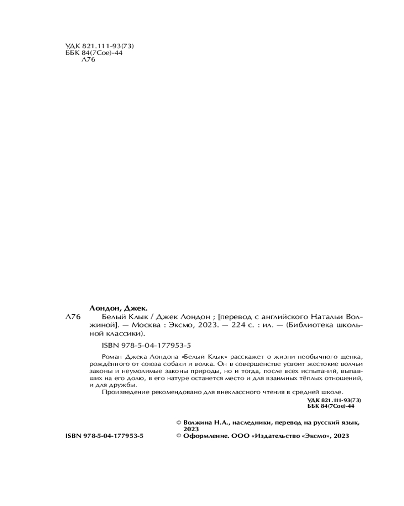 В данный момент этот товар отсутствует в продаже. Возможно, у нас найдется аналогичный или похожий товар здесь. Серия: Библиотека школьной классики «Библиотека школьной классики» — элегантная, изящная серия книг, необходимых в каждом доме. Каждый том серии — это встреча с прекрасным, которая запомнится навсегда. В романе Джека Лондона «Белый Клык» контрастность нашего мира отображается особенно ярко: произведение начинается на далёком севере, во власти природы, а его финал разворачивается на тёплом юге. На протяжении всего романа жестокость и ненависть противопоставляются человечности и дружбе. И даже главный герой, волк по имени Белый Клык, рождён от союза домашней собаки и дикого волка.
