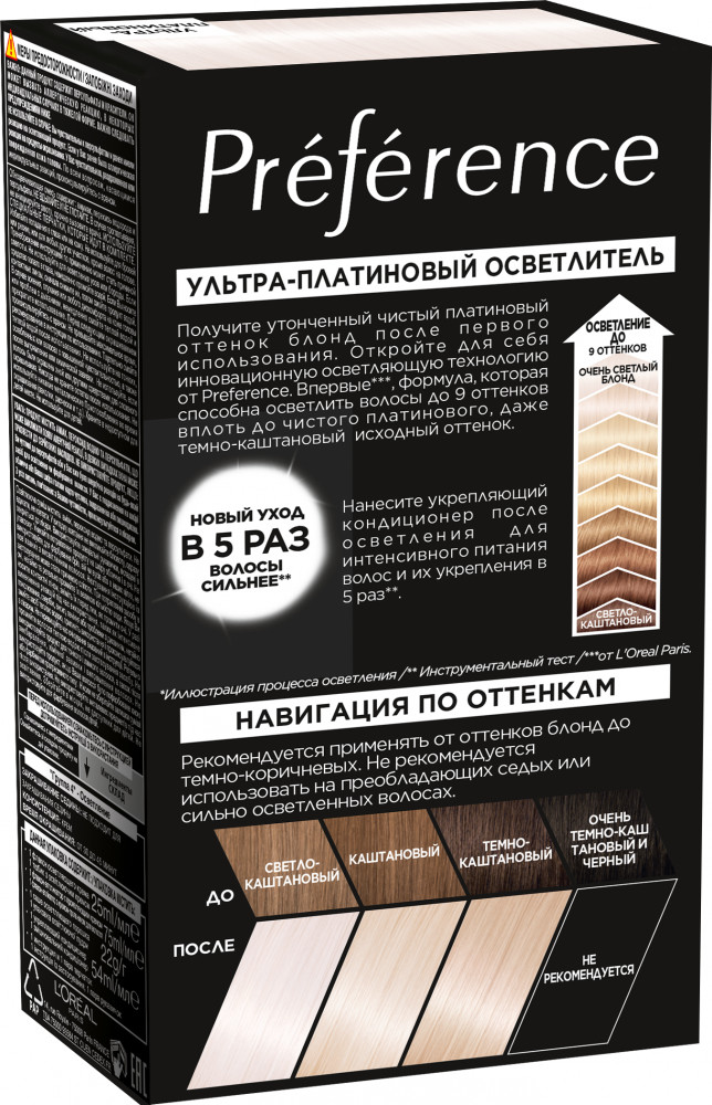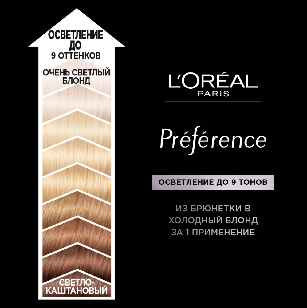 L'Oreal Paris Осветлитель для волос «Préférence» осветление до 9 тонов, ультра-платиновый блонд-20% +220 смягчающий бальзам слабое осветление жёлтый оттенок пигмент неэффективен