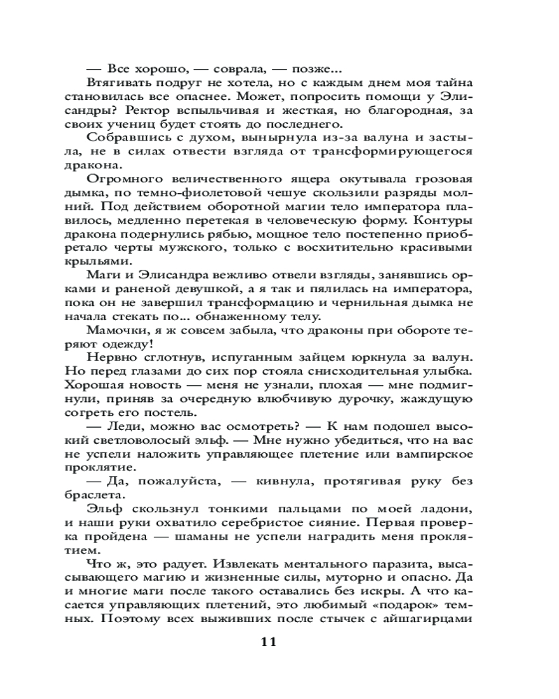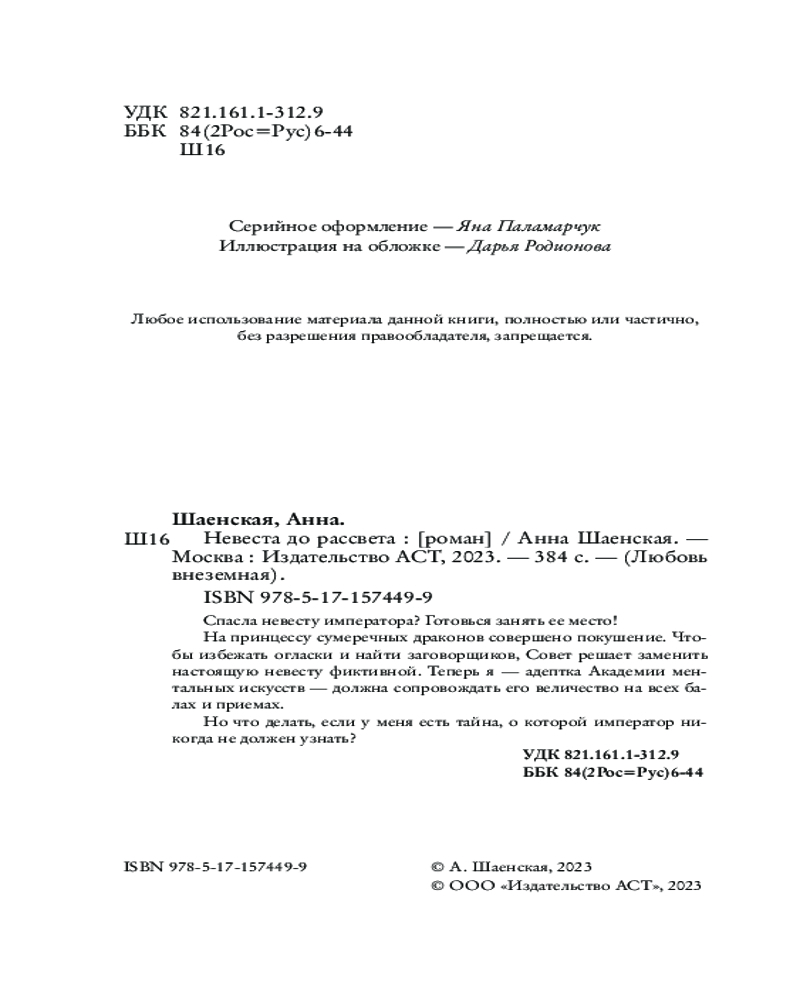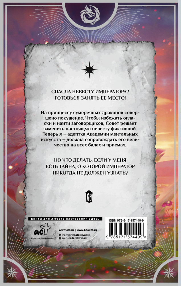 💳 Оплатить за товар можно при получении 🇰🇿 Есть бесплатная доставка по Казахстану от 1 дня 🎁 Копите бонусы с каждой покупки Серия: Любовь внеземная Спасла невесту императора? Готовься занять ее место! На принцессу сумеречных драконов совершено покушение. Чтобы избежать огласки и найти заговорщиков, Совет решает заменить настоящую невесту фиктивной. Теперь я — адептка Академии ментальных искусств — должна сопровождать его величество на всех балах и приемах. Но что делать, если у меня есть тайна, о которой император никогда не должен узнать? |