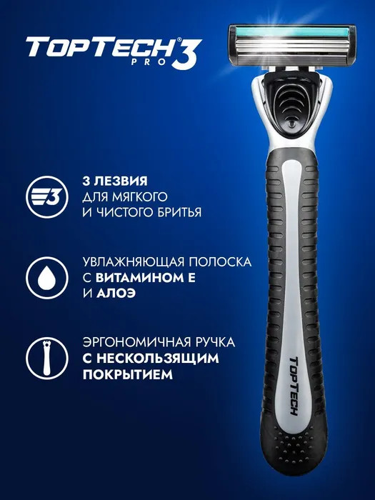💳 Оплатить за товар можно при получении 🇰🇿 Есть бесплатная доставка по Казахстану от 1 дня 🎁 Копите бонусы с каждой покупки Бритва TopTech Pro 3 изготовлена из композитных материалов. Прорезиненная вставка позволяет сделать процесс бритья максимально комфортным. Сменные кассеты имеют специальную смазывающую полоску с добавлением минералов, масел, экстракта алоэ-вера, которая защищает кожу от раздражения для лучшего результата при каждом бритье. |