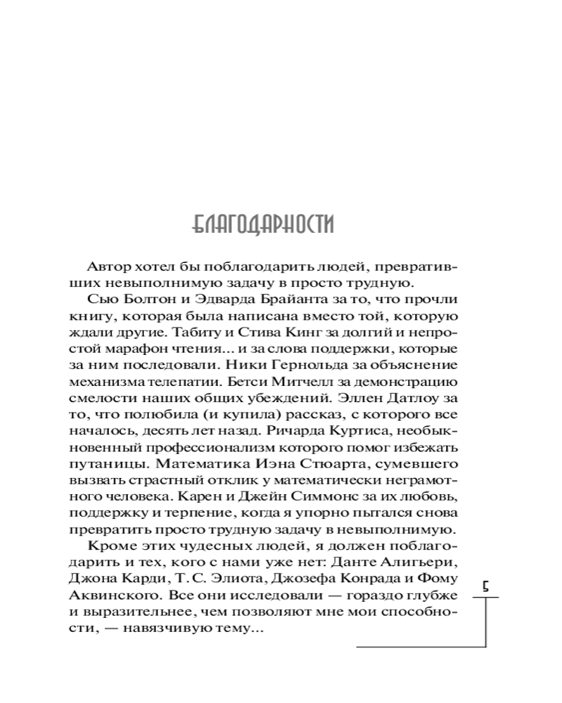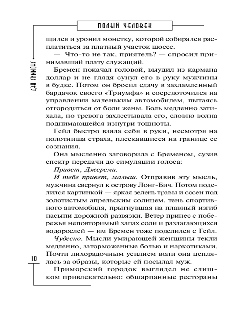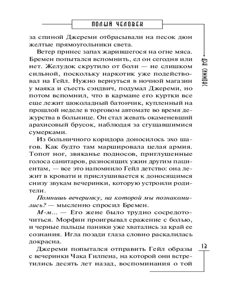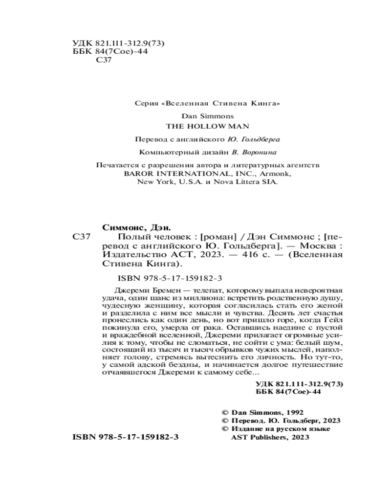 💳 Оплатить за товар можно при получении 🇰🇿 Есть бесплатная доставка по Казахстану от 1 дня 🎁 Копите бонусы с каждой покупки Серия: Вселенная Стивена Кинга Джереми Бремен — телепат, которому выпала невероятная удача, один шанс из миллиона: встретить родственную душу, чудесную женщину, которая согласилась стать его женой и разделила с ним все мысли и чувства. Десять лет счастья пронеслись как один день, но вот пришло горе, когда Гейл покинула его, умерла от рака. Оставшись наедине с пустой и враждебной вселенной, Джереми прилагает огромные усилия к тому, чтобы не сломаться, не сойти с ума: белый шум, состоящий из тысяч и тысяч обрывков чужих мыслей, наполняет голову, стремясь вытеснить его личность. Но тут-то, у самой адской бездны, и начинается долгое путешествие отчаявшегося Джереми к самому себе... |