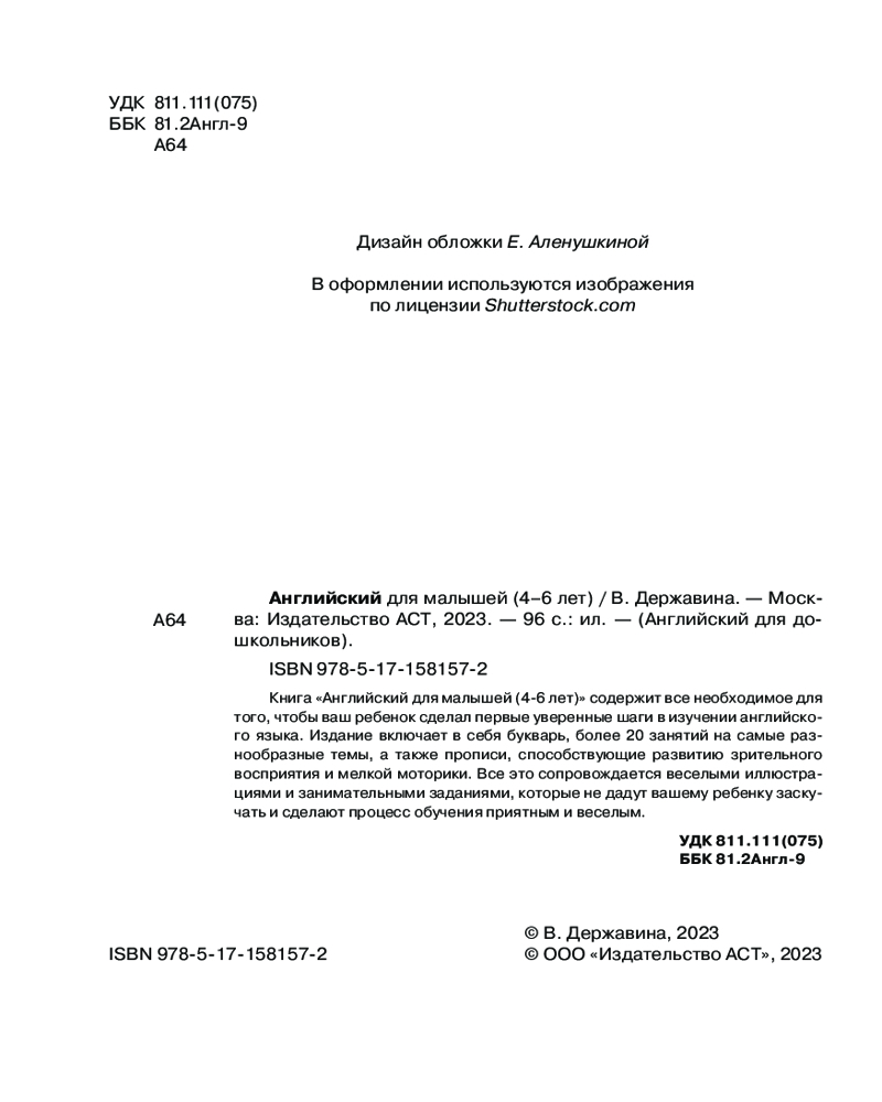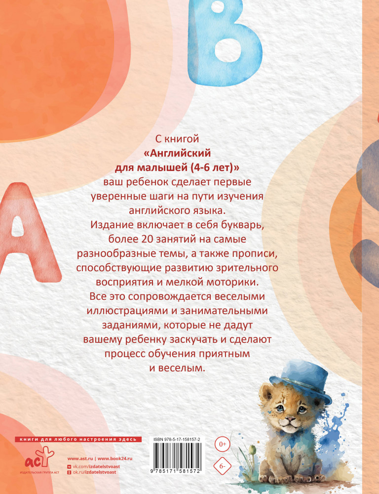💳 Оплатить за товар можно при получении 🇰🇿 Есть бесплатная доставка по Казахстану от 1 дня 🎁 Копите бонусы с каждой покупки Серия: Английский для дошкольников Книга «Английский для малышей (4-6 лет)» содержит все необходимое для того, чтобы ваш ребенок сделал первые уверенные шаги в изучении английского языка. Издание включает в себя букварь, более 20 занятий на самые разнообразные темы, а также прописи, способствующие развитию зрительного восприятия и мелкой моторики. Все это сопровождается веселыми иллюстрациями и занимательными заданиями, которые не дадут вашему ребенку заскучать и сделают процесс обучения приятным и веселым. |