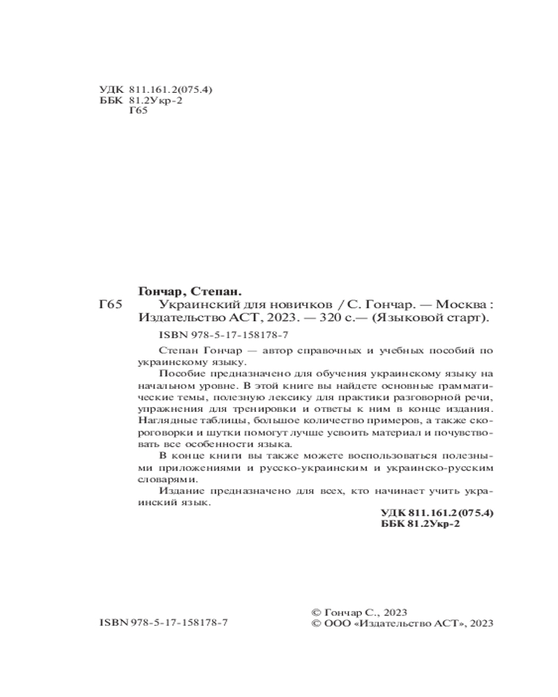 💳 Оплатить за товар можно при получении 🇰🇿 Есть бесплатная доставка по Казахстану от 1 дня 🎁 Копите бонусы с каждой покупки Серия: Языковой старт Степан Гончар — автор справочных и учебных пособий по украинскому языку. Пособие предназначено для обучения украинскому языку на начальном уровне. В этой книге вы найдете основные грамматические темы, полезную лексику для практики разговорной речи, упражнения для тренировки и ответы к ним в конце издания. Наглядные таблицы, большое количество примеров, а также скороговорки и шутки помогут лучше усвоить материал и почувствовать все особенности языка. |
