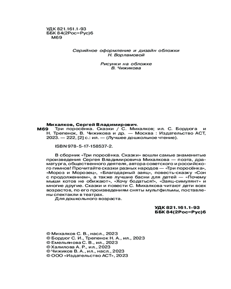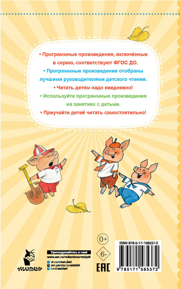 Три поросёнка. СказкиВ данный момент этот товар отсутствует в продаже. Возможно, у нас найдется аналогичный или похожий товар здесь. Серия: Лучшее дошкольное чтение В сборник «Три поросёнка. Сказки» вошли самые знаменитые произведения Сергея Владимировича Михалкова — поэта, драматурга, общественного деятеля, автора советского и российского гимнов! Прочитайте сказки разных народов — «Три поросёнка», «Мороз и Морозец», «Благодарный заяц», повесть-сказку «Сон с продолжением», а также лучшие басни для детей — «Почему мыши котов не обижают», «Хочу бодаться!», «Заяц-симулянт» и многие другие. Сказки и повести С. Михалкова читают дети всех возрастов, по его произведениям сняты мультфильмы, поставлены спектакли в театрах. |