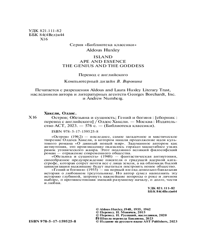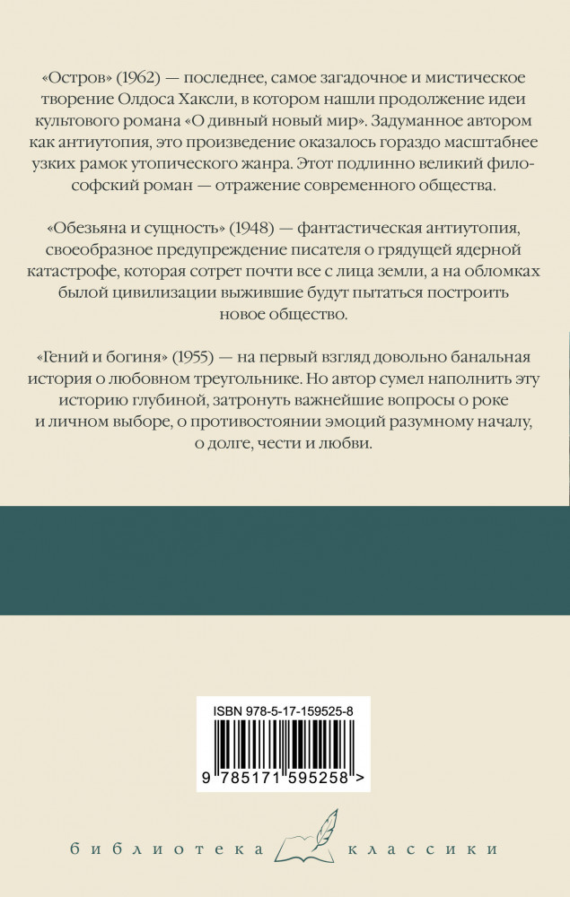💳 Оплатить за товар можно при получении 🇰🇿 Есть бесплатная доставка по Казахстану от 1 дня 🎁 Копите бонусы с каждой покупки Серия: Библиотека классики «Остров» (1962) — последнее, самое загадочное и мистическое творение Олдоса Хаксли, в котором нашли продолжение идеи культового романа «О дивный новый мир». Задуманное автором как антиутопия, это произведение оказалось гораздо масштабнее узких рамок утопического жанра. Этот подлинно великий философский роман — отражение современного общества. «Обезьяна и сущность» (1948) — фантастическая антиутопия, своеобразное предупреждение писателя о грядущей ядерной катастрофе, которая сотрет почти все с лица земли, а на обломках былой цивилизации выжившие будут пытаться построить новое общество. |