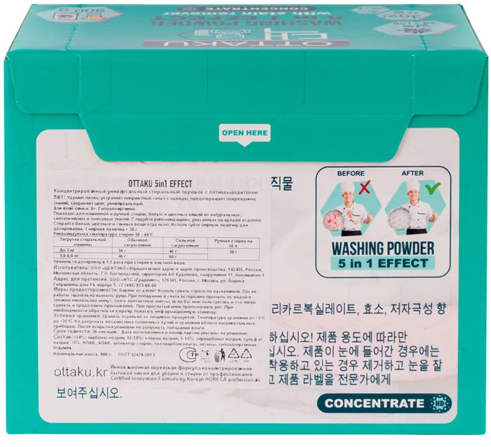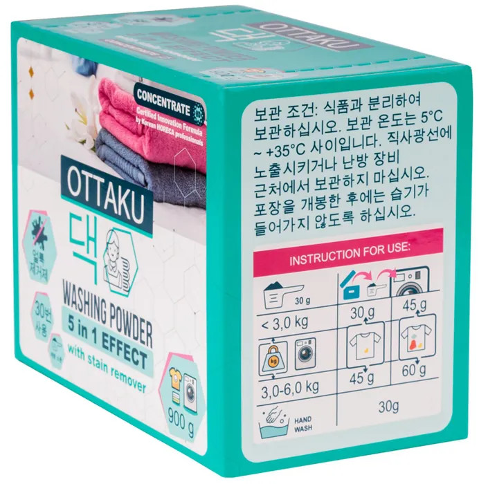 Стиральный порошок Ottaku 5 в 1 в бирюзовой коробке содержит в себе кислородный пятновыводитель, что обеспечивает дополнительный очищающий эффект и помогает в выведении сложных пятен. Благодаря специальным безопасным гранулам в составе стирка будет эффективна в холодной воде. При том, что корейский порошок обладает эффективной формулой, средство для стирки является гипоаллергенным и подходит для стирки детских вещей с 0 лет.