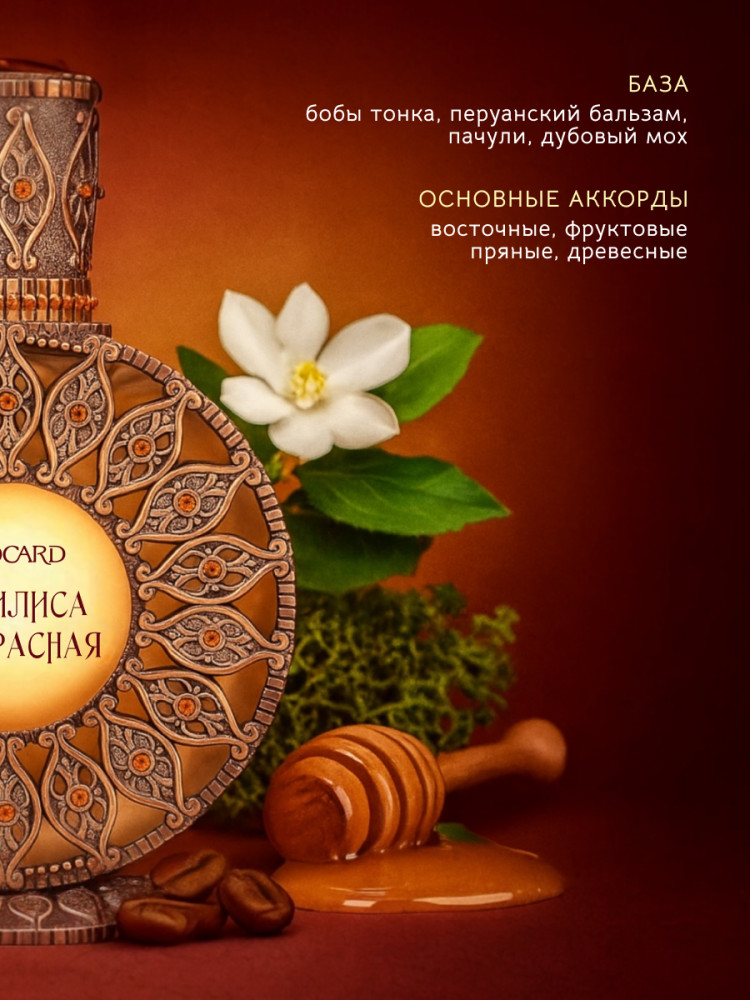 Хороший, бальзамический аромат с медом, пачули и восточными благовониями. Слегка сладкий, густой, плотный. Стойкость средняя. Флакон - просто произведение искусства. Зимой должен быть особенно хорош.
