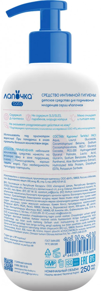 💳 Оплатить за товар можно при получении 🇰🇿 Есть бесплатная доставка по Казахстану от 1 дня 🎁 Копите бонусы с каждой покупки Деликатное очищение самой нежной кожи в зоне подгузника, обеспечивающее мягкий уход и поддержание слабокислой среды, это чрезвычайно важная часть каждодневного ухода за малышом с первых дней его жизни. Средство для подмывания младенцев «Лапочка» разработано специально для ухода за нежной чувствительной кожей, предрасположенной к сухости и раздражениям, с учетом особенностей и потребностей такой кожи с первых дней жизни ребенка. Продукт не содержит сульфатов (SLS, SLES), хлоридов, парабенов и красителей. Нежная гипоаллергенная пудровая отдушка, входящая в состав средства, подарит прекрасное настроение маме и малышу. Удобная упаковка позволяет использовать средство одной рукой. Оптимальный состав обеспечивает правильный уход и очищение. |