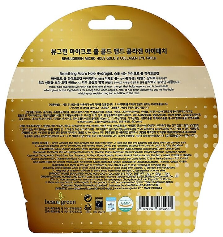 BeauuGreen Маска-патч для глаз с золотом и коллагеном