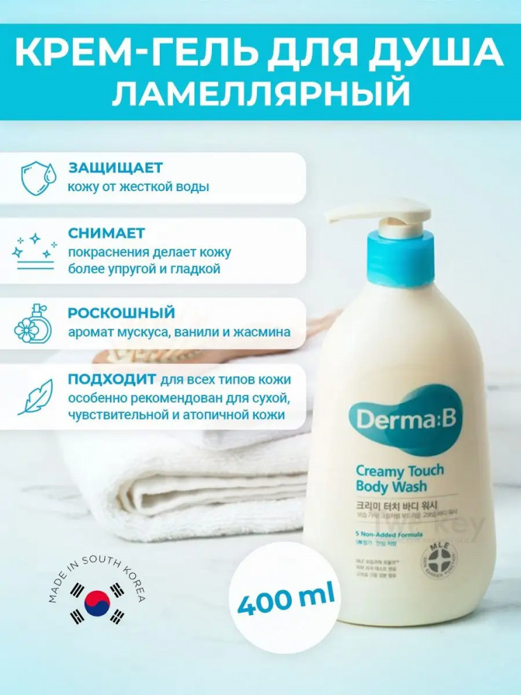 Derma:B Крем-гель для душа на ламеллярной эмульсии «Creamy Touch Body Wash»В данный момент этот товар отсутствует в продаже. Возможно, у нас найдется аналогичный или похожий товар здесь. Ламеллярный крем-гель для душа Derma:B Creamy Touch Body Wash бережно очищает, устраняет сухость и шелушения, делает кожу нежной и бархатистой. Защищает кожу от жесткой воды, сухого воздуха и холодных температур, препятствует появлению раздражений. Восстанавливает и поддерживает естественный воднолипидный баланс, препятствует появлению стянутости и обезвоженности. Снимает покраснения, делает кожу более упругой и гладкой. В составе крем-геля используется особая ламеллярная технология Multi Lamellar Emulsion, которая усиливает кожный барьер и повышает защитные функции кожи. |