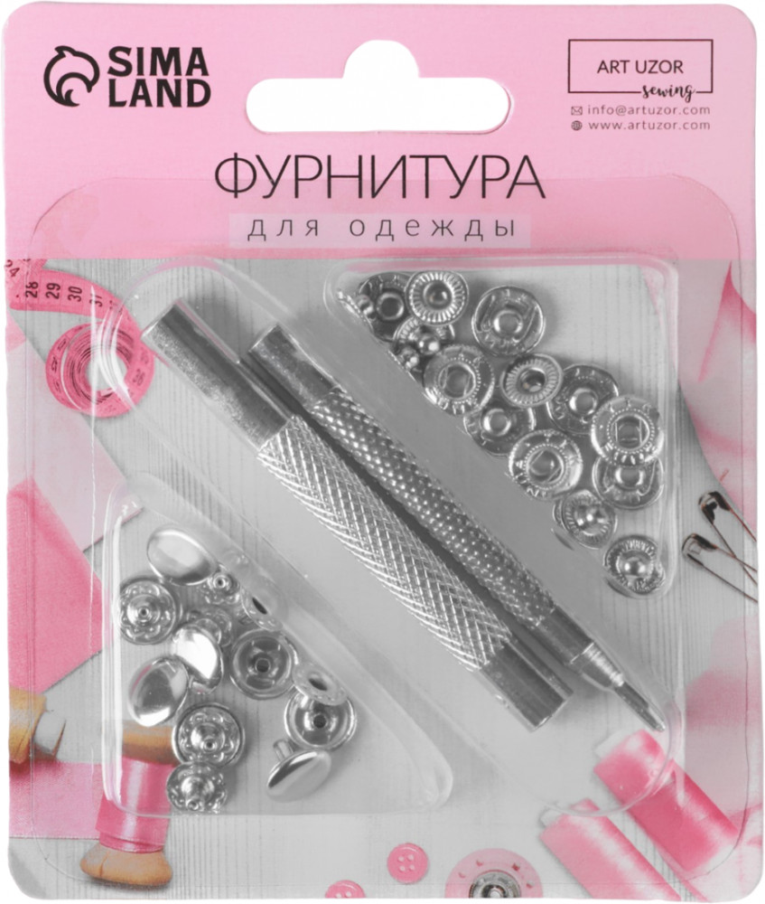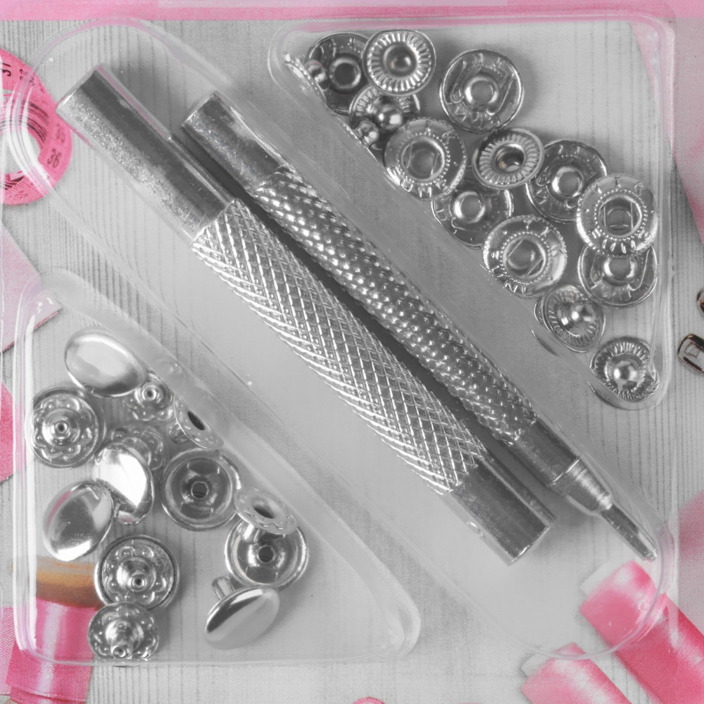 Установочные кнопки прочные и гладкие, очень удобны в использовании. С помощью нескольких отверстий они незаметно крепятся к одежде и служат надежной застежкой. Швейное оборудование простое в применении, фурнитура имеет удобный для работы размер. Творческий процесс будет проходить комфортно и легко. Такой набор для рукоделия — идеальный вариант подарка людям, занимающихся шитьем, а также реставрацией текстильных изделий. В комплекте прилагается установщик.