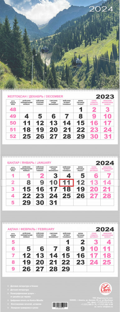 Календарь квартальный РК на 2024 год «Горы Медеу-Шымбулак»В данный момент этот товар отсутствует в продаже. Возможно, у нас найдется аналогичный или похожий товар здесь. Календарь квартальный настенный с праздничными и выходными днями в РК на 2024 год. Из 3-х блоков по 12 страниц на пружине. Размер календаря 30 см на 90 см. Календарь имеет русский, английский, казахский языка. Имеется бегунок. |