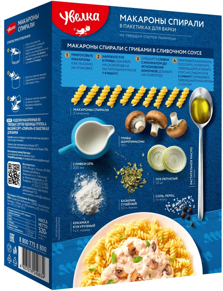 Увелка Макароны спиралиВ данный момент этот товар отсутствует в продаже. Возможно, у нас найдется аналогичный или похожий товар здесь. Макароны — один из любимых гарниров, который любят как взрослые, так и дети. Одна из самых популярных форм макаронных изделий — спирали. Макароны — необычные, они варятся прямо в пакете, при этом не слипаются и не требуют вашего внимания. Главное — засечь время варки! |