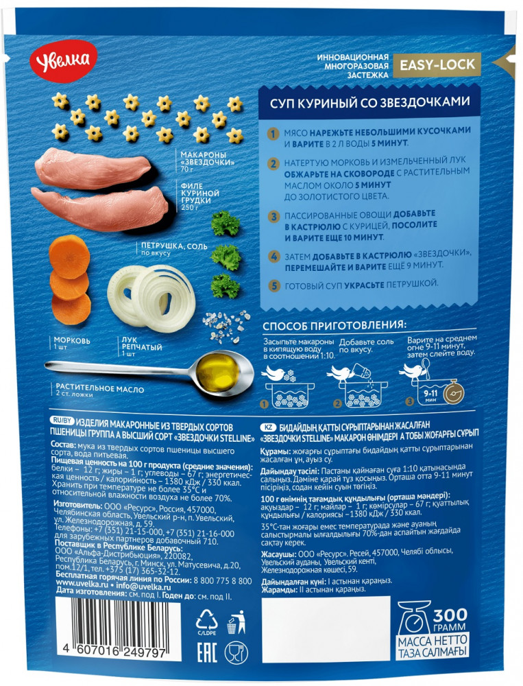 Увелка Изделия макаронные «Звездочки Stelline»В данный момент этот товар отсутствует в продаже. Возможно, у нас найдется аналогичный или похожий товар здесь. Серия: Pasta Пасту из твердых сортов пшеницы в форме звездочек чаще всего добавляют в супы или готовят интересные гарниры детям. Добавить пасту в суп нужно в конце приготовления, как указано в рецепте на упаковке. Пасту очень удобно хранить в упаковке: после вскрытия нужно плотно закрыть застежку easy-lock, которая обеспечит ее сохранность. |