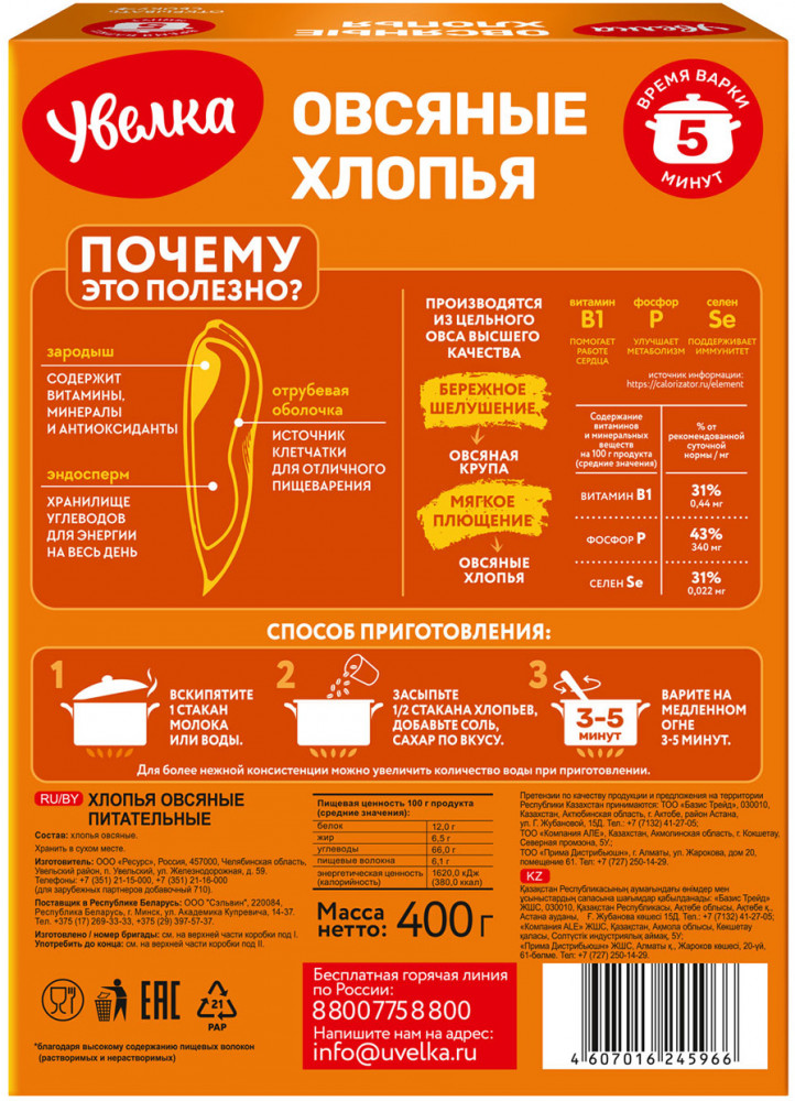 Увелка Хлопья овсяные питательныеВ данный момент этот товар отсутствует в продаже. Возможно, у нас найдется аналогичный или похожий товар здесь. Серия: Доброе утро Овсяные хлопья являются источником пищевых волокон, которые связывают холестерин и помогают снизить уровень сахара в крови. Также в овсянке много клетчатки, витаминов, минералов поэтому она, надолго утоляет голод и снабжает организм энергией на весь день. |
