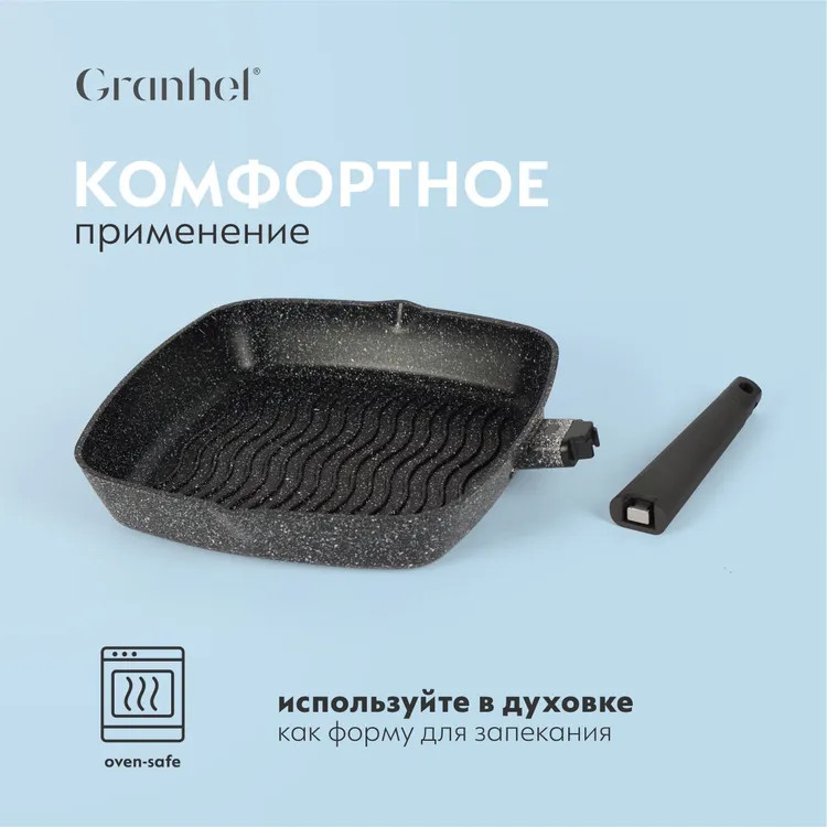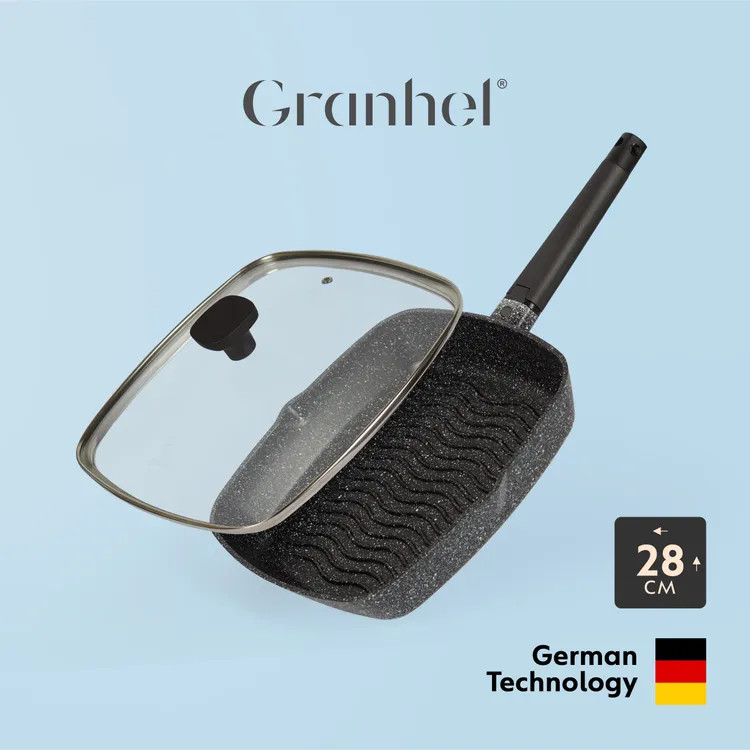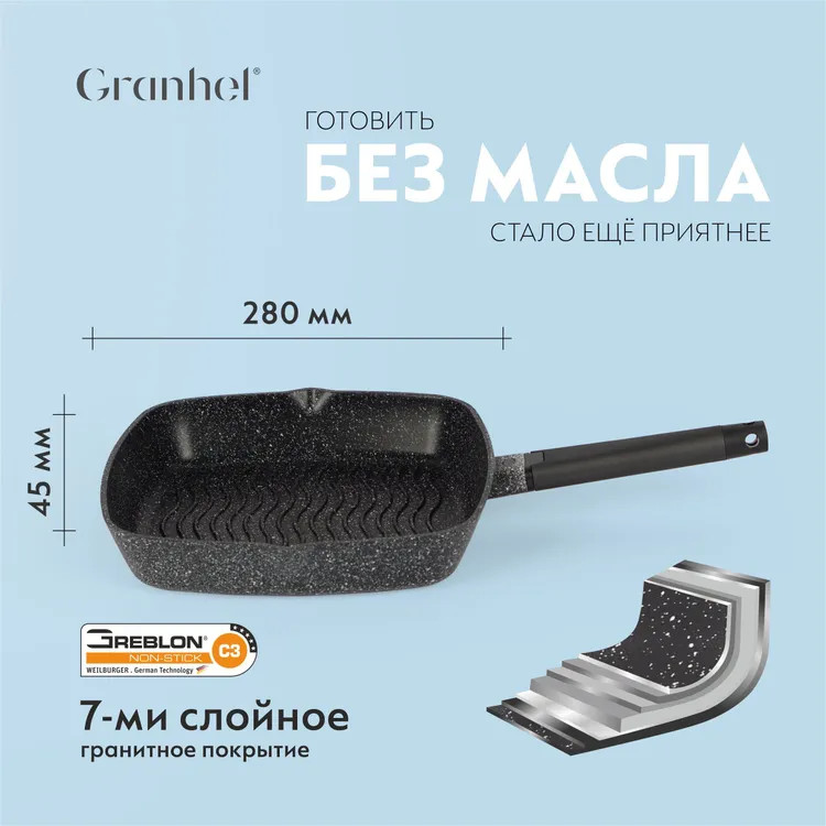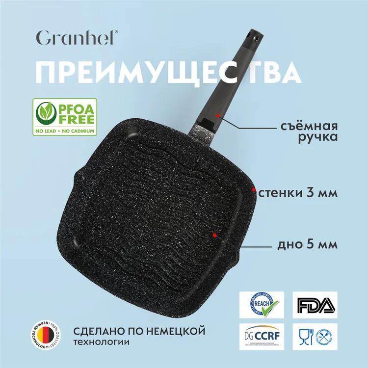 Granhel Сковорода-гриль с крышкой «Nature»В данный момент этот товар отсутствует в продаже. Возможно, у нас найдется аналогичный или похожий товар здесь. Серия: Nature Гриль-сковорода с крышкой произведенная по немецкой технологии с использованием натурального гранитного покрытия. Основа из литого алюминия с четырехслойным капсульным дном, семислойное гранитное покрытие с антипригарными свойствами и дополнительным покрытием Greblon C3. Сковорода имеет съёмную ручку из жаропрочного бакелита с покрытием soft-touch. Крышка из жаропрочного стекла с металлическим кантом и пароотводом. Подходит для всех видов плит и мытья в посудомоечной машине без использования абразивных средств. |