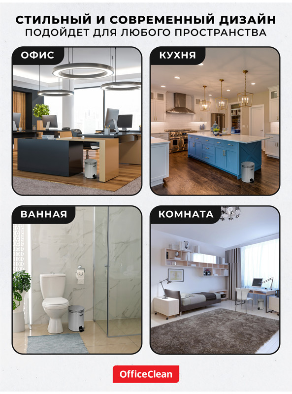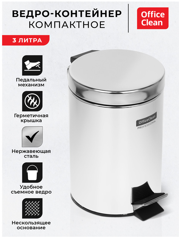 Ведро-контейнер OfficeClean — отличный вариант для поддержания чистоты и гигиены на кухне, в санузле, в офисах, заведениях общественного питания. Корпус контейнера вместе с крышкой изготовлен из нержавеющей стали. Крышка плотно прилегает, тем самым препятствуя распространению запахов. Внутреннее съемное пластиковое ведро имеет удобную рукоятку для извлечения. Контейнер устойчив благодаря антискользящему основанию. Отвечает всем требованиям гигиены. Рекомендуемый объем мешка 10 л.
