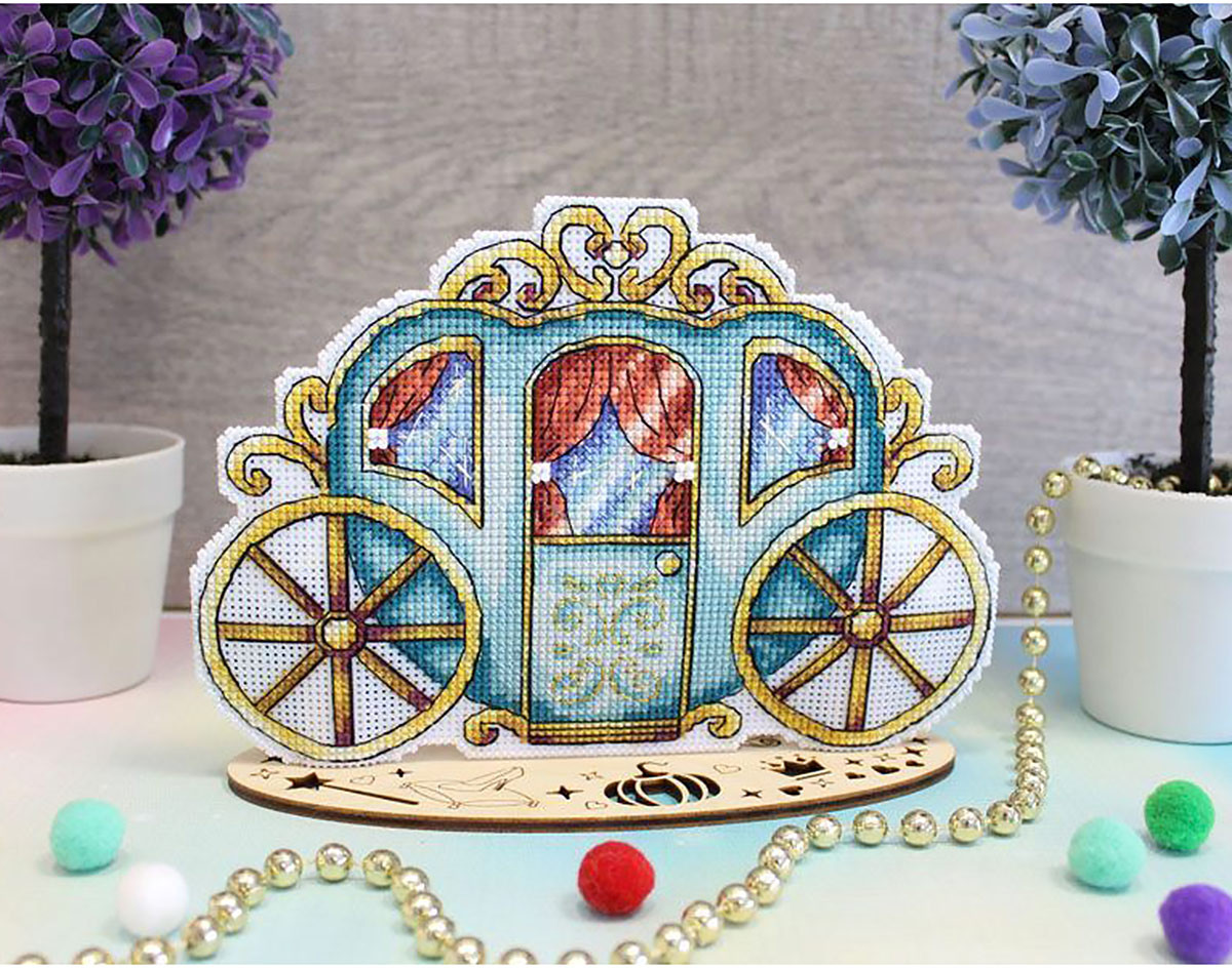 Сделайте своими руками яркий сувенир «Карета» — это увлекательно и быстро. Набор подойдет даже начинающим, достаточно проявить терпение, аккуратность и освоить простую технику «крест». Пяльцы или рамки не понадобятся — пластиковая канва отлично держит форму. Готовые элементы надо вырезать по контуру и соединить между собой аккуратными стежками. При желании вклейте между деталями ленту-подвес.