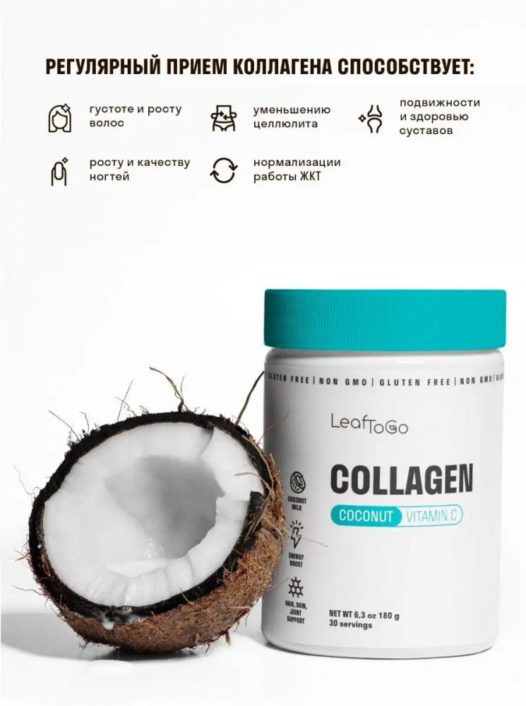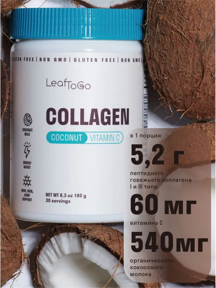 LeafToGo Коллаген пептидный с витамином С со вкусом кокосаВ данный момент этот товар отсутствует в продаже. Возможно, у нас найдется аналогичный или похожий товар здесь. Сollagen LeafToGo — это продукт, созданный из высококачественного пептидного коллагена. Коллаген — это важнейший белок, из которого строятся соединительные ткани, прежде всего — связки и суставы, требующие прочности и эластичности, так же он входит в состав кожи, а еще волос и ногтей, обеспечивая их рост и красоту.Важно принимать коллаген вместе с витамином C, который уже есть в составе. Не содержит ГМО. |