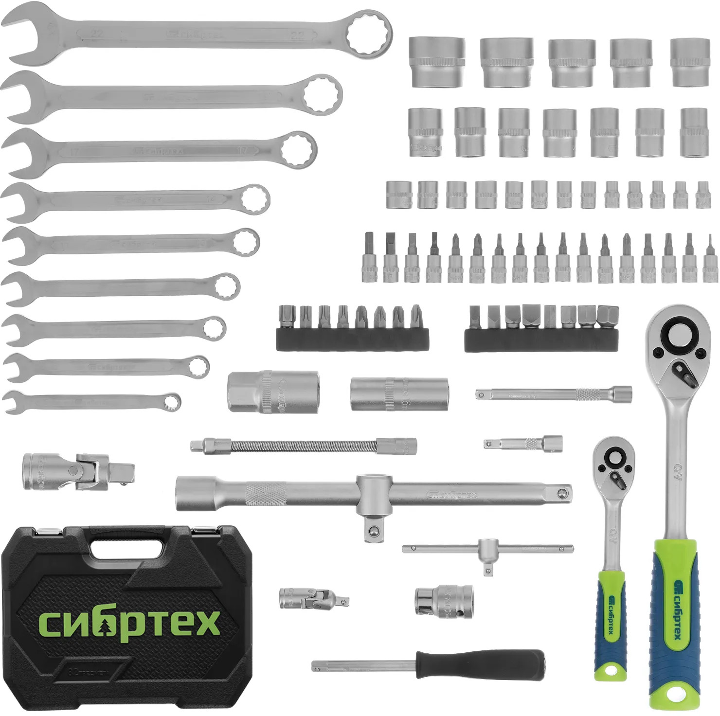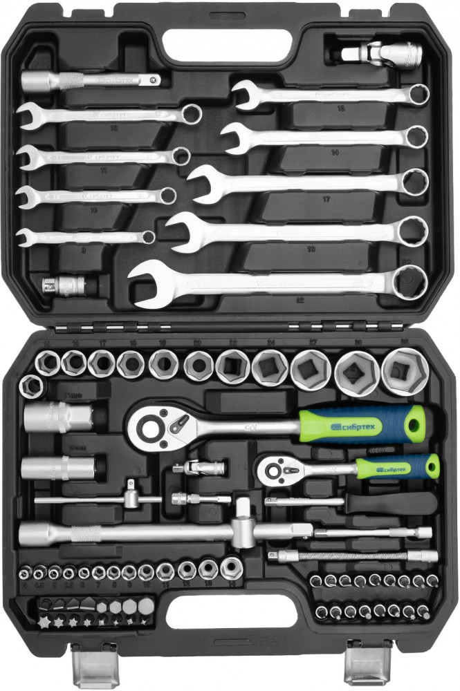 Набор инструментов Сибртех упакован в пластиковый кейс и состоит из 82 предметов с присоединительным размером 1/2″" и 1/4″", предназначенных для слесарных работ, преимущественно монтажа и демонтажа резьбового крепежа с разными типами шлицев. В комплект поставки входят карданы, удлинители и переходники, облегчающие работу в труднодоступных местах. Набор используется для ремонта автомобилей, а также полезен в быту.