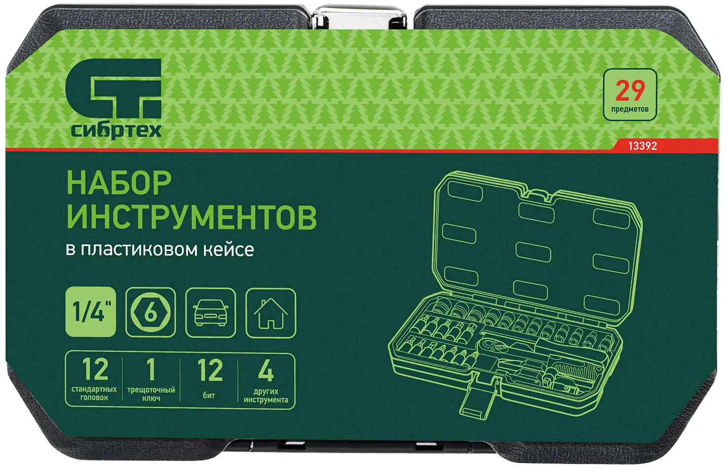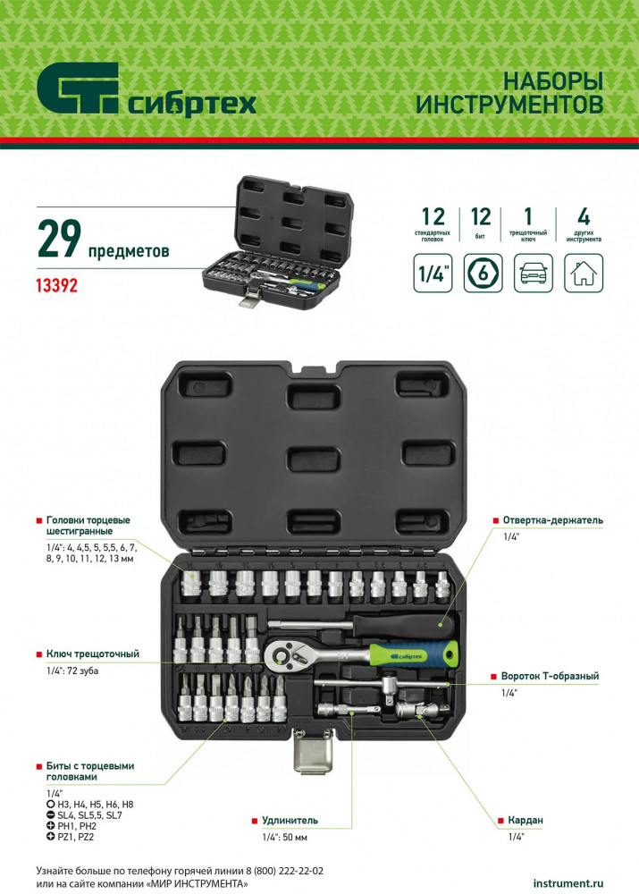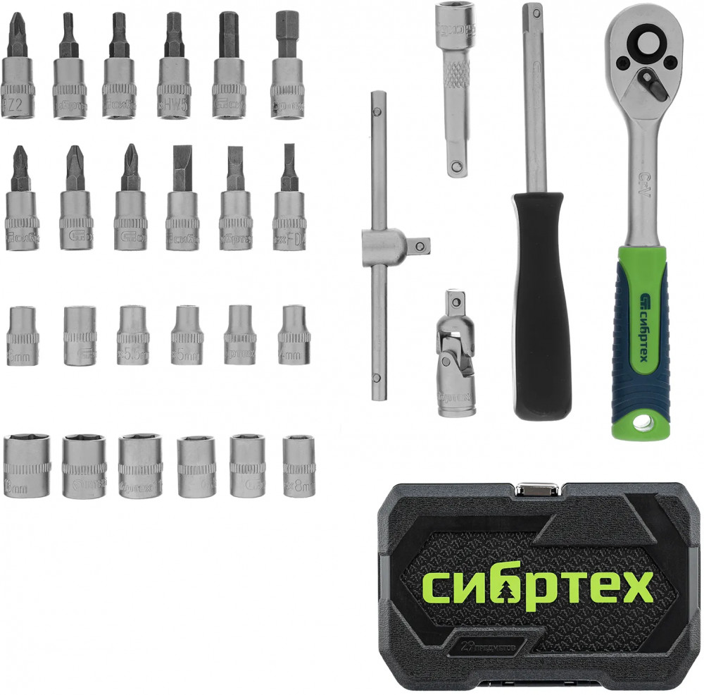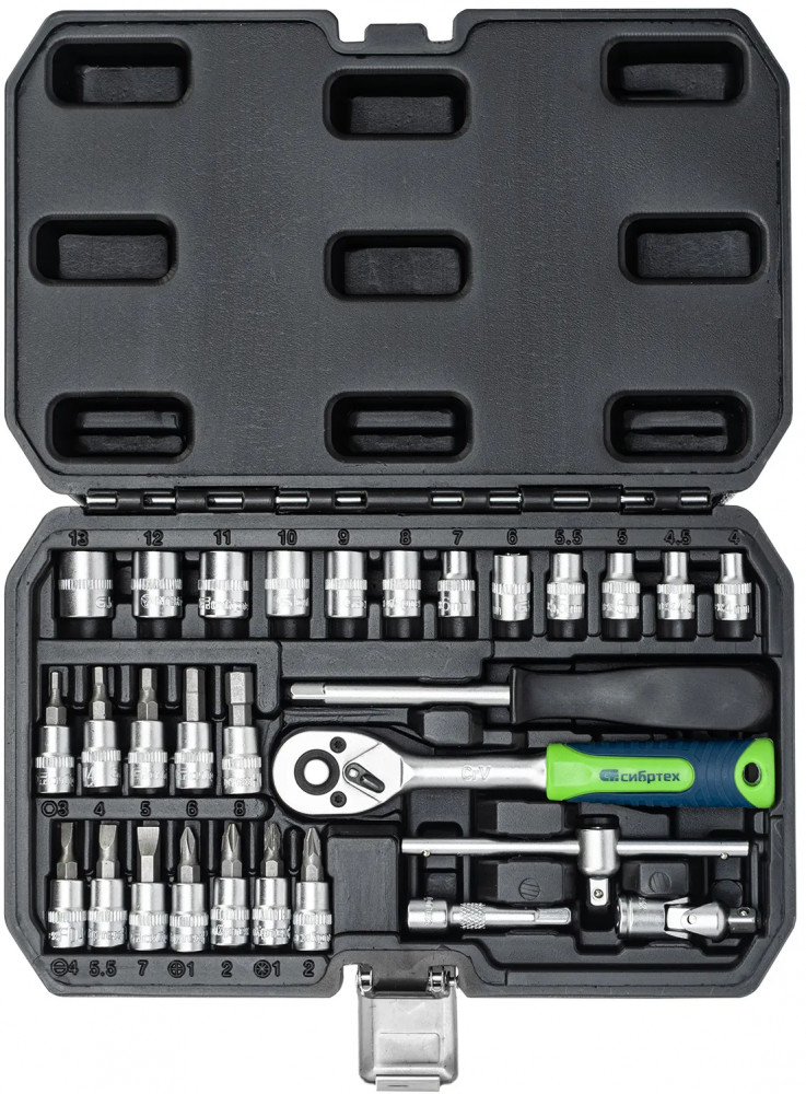 Набор инструментов Сибртех, поставляющийся в пластиковом кейсе, состоит из 29 предметов с присоединительным размером 1/4"", предназначенных для работы с резьбовыми соединениями. В комплект поставки входят кардан, удлинитель и вороток, упрощающие работу в труднодоступных местах. Набор будет полезен автолюбителю и домашнему мастеру.