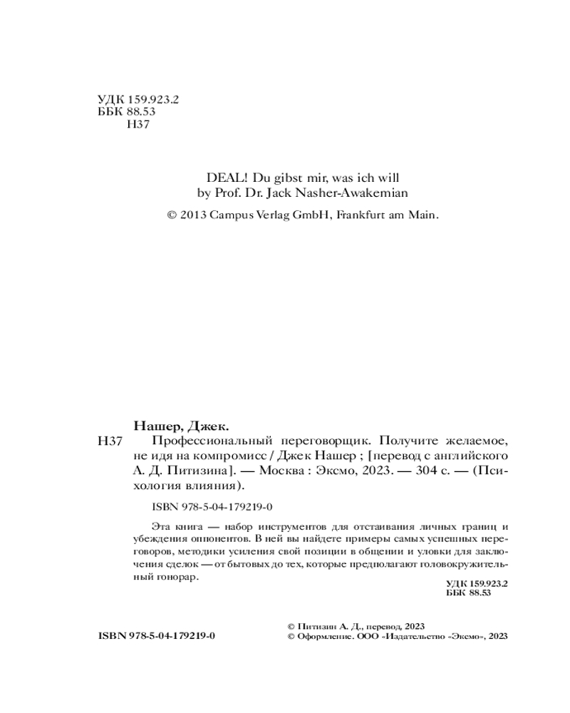 В данный момент этот товар отсутствует в продаже. Возможно, у нас найдется аналогичный или похожий товар здесь. Серия: Психология влияния Мы получаем не то, что заслуживаем, а то, что сумели себе выторговать. Так считает Джек Нашер, бизнес-психолог и один из ведущих специалистов по переговорам в немецкоязычном мире. В своей книге он предлагает авторские методы ведения переговоров, которые работают независимо от того, обсуждаете ли вы раздробление авиакомпании или делите яблоко.
