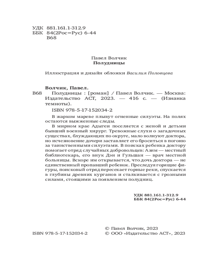 💳 Оплатить за товар можно при получении 🇰🇿 Есть бесплатная доставка по Казахстану от 1 дня 🎁 Копите бонусы с каждой покупки Серия: Изнанка темноты Действительно страшная история. Боди-хоррор «Полудницы» принес петербургскому писателю Павлу Волчику Национальную литературную премию и всероссийскую славу.Республика Адыгея — место, где древнее, мудрое и опасное все еще бродит вблизи человека. Бывший военный хирург перебирается в этот край вместе с семьей, но спокойная жизнь длится недолго. Сначала — зловещие слухи об огненных фигурах, блуждающих по округе. После — пропажа дочери. Собрав небольшой отряд и отправившись на поиски ребенка, доктор узнает, что исчезновение девочки — далеко не единственное. Погрузившись вглубь прекрасного и загадочного края, среди замшелых курганов и во власти изнуряющей жары, поисковая группа делает жуткое открытие... |