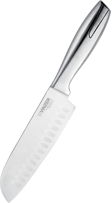Vinzer Нож сантокуВ данный момент этот товар отсутствует в продаже. Возможно, у нас найдется аналогичный или похожий товар здесь. Нож принадлежит к ножам типа сантоку — классическим универсальным японским ножам, которые могут используются для самых разнообразных задач: чтобы резать, рубить, крошить и пр. Чаще всего сантоку используют для тонкой нарезки овощных продуктов. Клиновидное лезвие, острая режущая кромка и воздушный карман (выемки овальной формы, которые препятствуют прилипанию продукта к лезвию) — это особенно важно при тонкой нарезке «липких» продуктов. Сам клинок Vinzer выполнен из высокоуглеродистой стали X30Cr13, отличающейся высокой экологичностью и крепостью. Эргономичной формы рукоять удобна для захвата. Она тоже выполнена из стали и не имеет зазоров. |