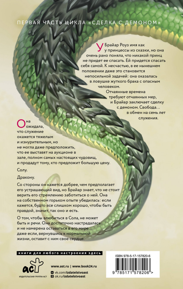 💳 Оплатить за товар можно при получении 🇰🇿 Есть бесплатная доставка по Казахстану от 1 дня 🎁 Копите бонусы с каждой покупки У Брайар Роуз имя как у принцессы из сказки, но она очень рано поняла, что никакой принц не придет ее спасать. Ей придется спасать себя самой. К несчастью, в ее нынешнем положении даже это становится непосильной задачей: она оказалась в ловушке жуткого брака с опасным человеком. Отчаянные времена требуют отчаянных мер, и Брайар заключает сделку с демоном. Свобода...в обмен на семь лет служения. |