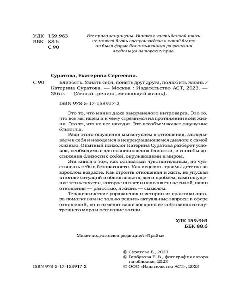 💳 Оплатить за товар можно при получении 🇰🇿 Есть бесплатная доставка по Казахстану от 1 дня 🎁 Копите бонусы с каждой покупки Серия: Умный тренинг, меняющий жизнь Сложно ли вам с самим собой? А с другими? Вы удивитесь, но отношения с другими людьми напрямую зависят от отношений с собой. Если вы уважаете и любите, принимаете себя, прислушиваетесь, внимательны к себе, то такое же отношение получают от вас и ваши близкие. Близость с собой является основой для здоровой и счастливой близости с другими.Если вы испытываете трудности в отношениях с другими и связь с собой нарушена, вам поможет книга психолога Катерины Суратовой «Близость. Узнать себя, понять друг друга, полюбить жизнь». В книге Катерина рассказывает истории пациентов из личной практики. Через эти истории вы ясно увидите и свои трудности, а практики и упражнения укажут вам путь исцеления. Вы начнете прорабатывать травмы из детства и укоренившиеся негативные установки, откроетесь себе, близким и миру; начнете любить и ценить себя и свою жизнь. |
