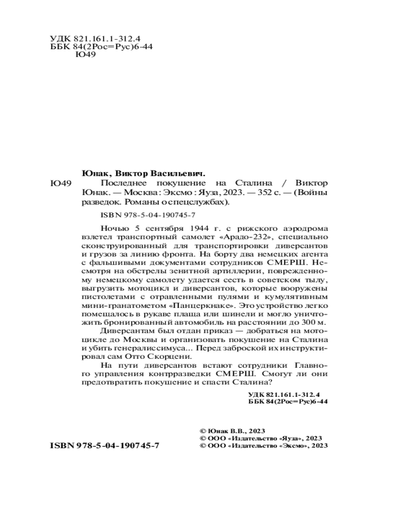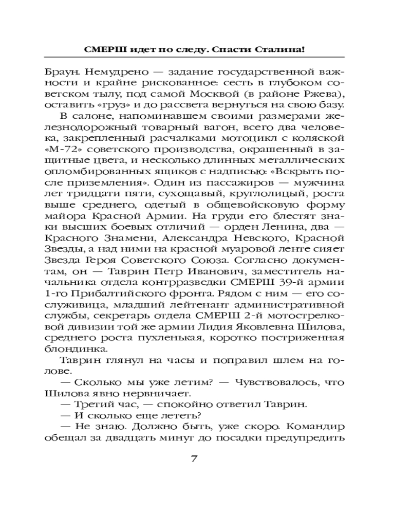 💳 Оплатить за товар можно при получении 🇰🇿 Есть бесплатная доставка по Казахстану от 1 дня 🎁 Копите бонусы с каждой покупки Серия: Войны разведок. Романы о спецслужбах Ночью 5 сентября 1944 г. с рижского аэродрома взлетел транспортный самолет «Арадо-232», специально сконструированный для транспортировки диверсантов и грузов за линию фронта. На борту два немецких агента с фальшивыми документами сотрудников СМЕРШа. Несмотря на обстрелы зенитной артиллерии, поврежденному немецкому самолету удается сесть в советском тылу, выгрузить мотоцикл и диверсантов, которые вооружены пистолетами с отравленными пулями и кумулятивным мини-гранатометом «Панцеркнаке». Это устройство легко помещалось в рукаве плаща или шинели и могло уничтожить бронированный автомобиль на расстоянии до 300 м. |