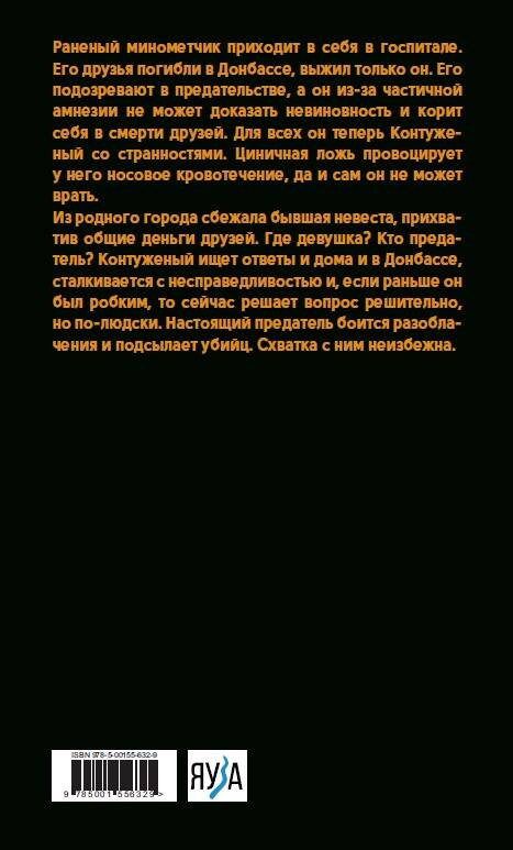 💳 Оплатить за товар можно при получении 🇰🇿 Есть бесплатная доставка по Казахстану от 1 дня 🎁 Копите бонусы с каждой покупки Серия: Военная проза ХХI века Раненый минометчик приходит в себя в госпитале. Его друзья погибли в Донбассе, выжил только он. Его подозревают в предательстве, а он из-за частичной амнезии не может доказать невиновность и корит себя в смерти друзей. Для всех он теперь Контуженый со странностями. Циничная ложь провоцирует у него носовое кровотечение, да и сам он не может врать. Из родного города сбежала бывшая невеста, прихватив общие деньги друзей. Где девушка? Кто предатель? Контуженый ищет ответы и дома и в Донбассе, сталкивается с несправедливостью и, если раньше он был робким, то сейчас решает вопрос решительно, но по-людски. Настоящий предатель боится разоблачения и подсылает убийц. Схватка с ним неизбежна. |