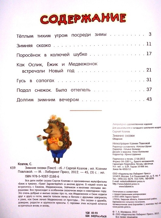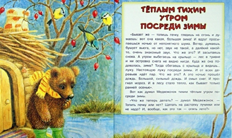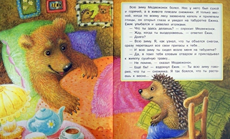 Очень часто выбираю книги по иллюстрациям. Иллюстрации Ксении Павловой очень понравились, такие рисованные, с душой. Текст трогательный (для меня), для дочи 4 лет смешной) — Что ты здесь делаешь? — спросил Медвежонок. — Жду, когда ты выздоровеешь, — ответил Ёжик. — Долго? — Всю зиму. Я, как узнал, что ты объелся снегом — сразу перетащил все свои припасы к тебе... — И всю зиму ты сидел возле меня на табуретке? — Да, я поил тебя еловым отваром и прикладывал к животу сушеную травку... — Не помню, — сказал Медвежонок. — Еще бы! — вздохнул Ёжик. — Ты всю зиму говорил, что ты — снежинка. Я так боялся, что ты растаешь к весне...