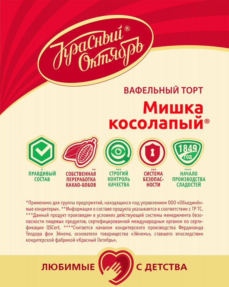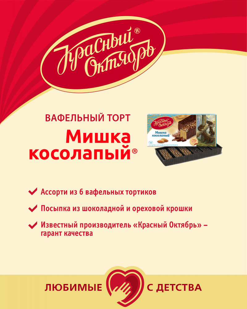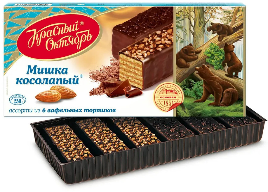Красный октябрь Торт вафельный «Мишка косолапый»В данный момент этот товар отсутствует в продаже. Возможно, у нас найдется аналогичный или похожий товар здесь. Торт «Мишка косолапый» вафельный — это ассорти мини-тортиков в удобной коробке с индивидуальными ячейками. Слои воздушных хрустящих вафель промазаны ароматным орехово-сливочным кремом, покрыты шоколадной глазурью и посыпкой из шоколадной и ореховой крошки. Душистый хрустящий торт, тающий во рту — замечательное дополнение к кофе и чаю. |