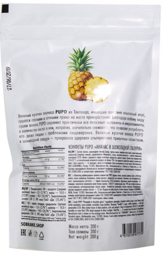 Pupo Ананас в шоколадной глазуриВ данный момент этот товар отсутствует в продаже. Возможно, у нас найдется аналогичный или похожий товар здесь. Вяленые кусочки ананаса Pupo из Таиланда, имеющие поистине изысканный вкус, сушатся спелыми и сочными прямо на месте произрастания. Благодаря особому виду сушки ананас Pupo сохраняет практически все полезные витамины и микроэлементы, а количество кислот в нем, напротив, значительно снижается, что позволяет употреблять его даже людям с проблемами пищеварения. Вяленые кусочки ананаса Pupo в шоколадной глазури — прекрасная здоровая альтернатива традиционным сладостям. |
