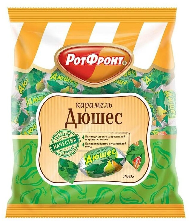 РотФронт Карамель «Дюшес»приятный вкус подходят как перекус ароматные не тот вкус (не как раньше) В данный момент этот товар отсутствует в продаже. Возможно, у нас найдется аналогичный или похожий товар здесь. Леденцы «Дюшес» — знаменитые грушевые леденцы фабрики «Рот Фронт». Насыщенный сладкий аромат спелой груши, сочный лимонадный вкус. Гладкие шарики травянисто-зеленого цвета так и просятся в рот. Незаменимые спутники в долгой дороге и прекрасные компаньоны для домашнего чаепития. Долгоиграющая сладость леденцов отлично сочетается с травяными и зелеными сортами чая, а также с холодными летними напитками. |