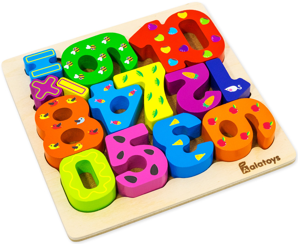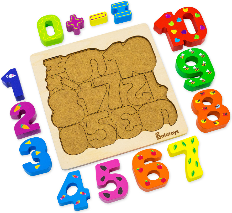Выложите все цифры из деревянной основы-сортера. Попросите ребенка разложить все цифры и знаки обратно так, чтобы каждая оказалась на своем месте. Затем снова выложите цифры и предложите ребенку выкладывать цифры по называнию. Например: найди и положи цифру 5. Спросите ребенка, какого цвета цифру он положил. Так, ребенок закрепляет название и образ цифр, названия цветов, а так же учится соотносить объемные детали с их плоским изображением, развивая зрительно-моторную координацию и внимание.