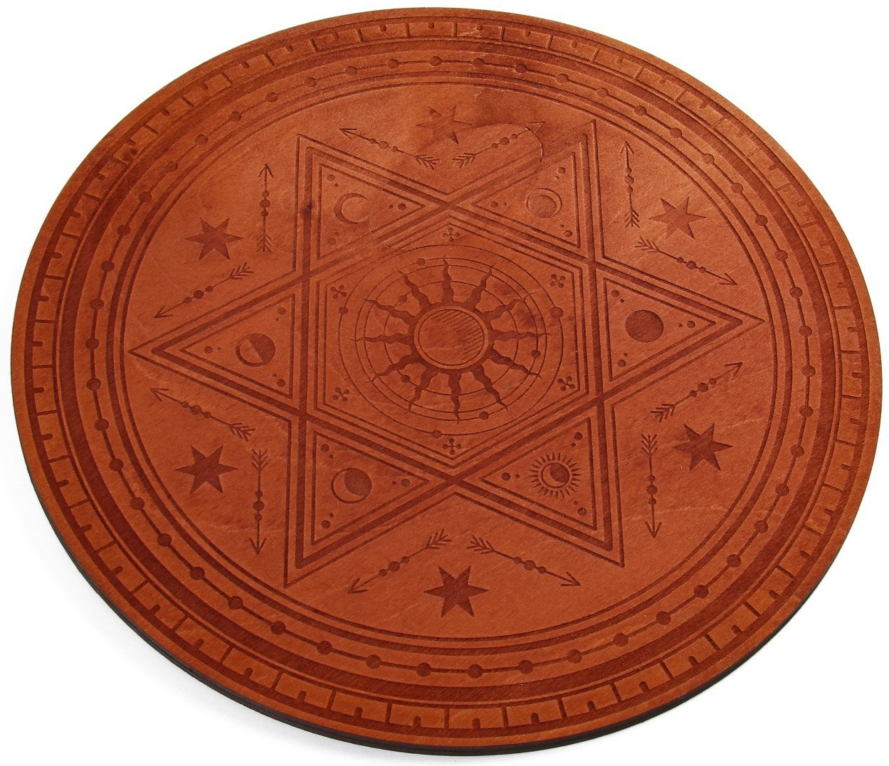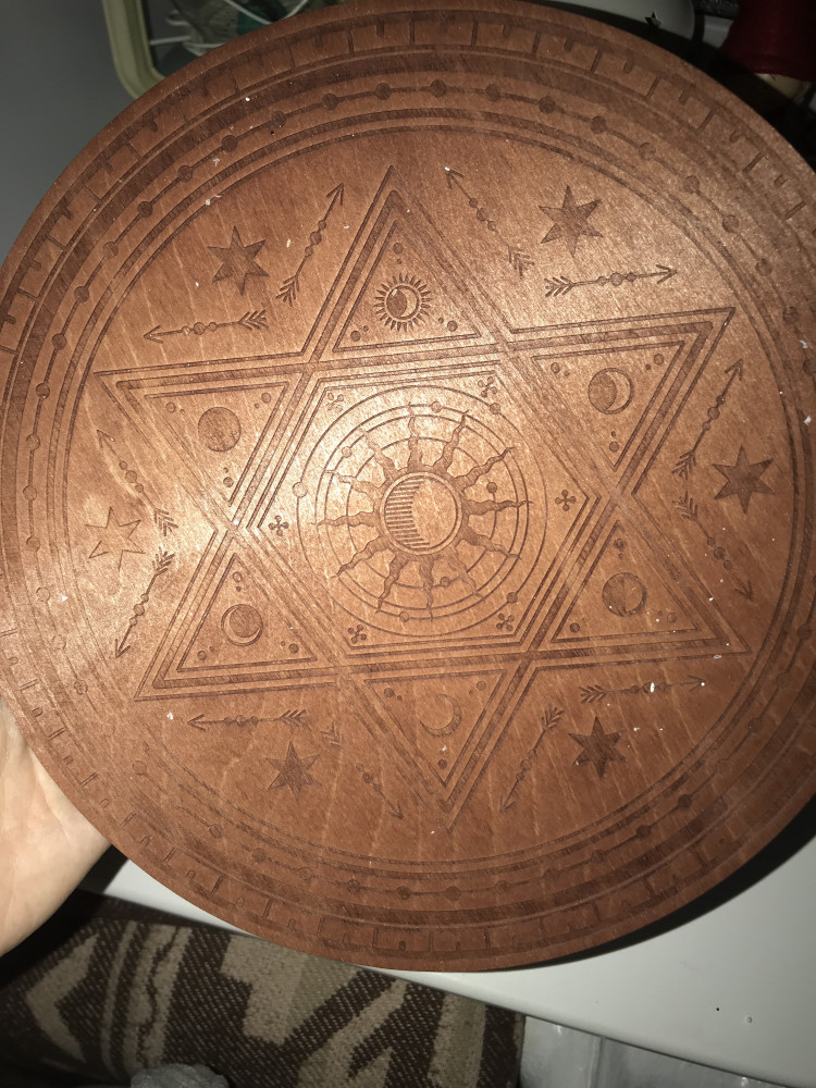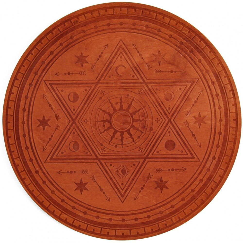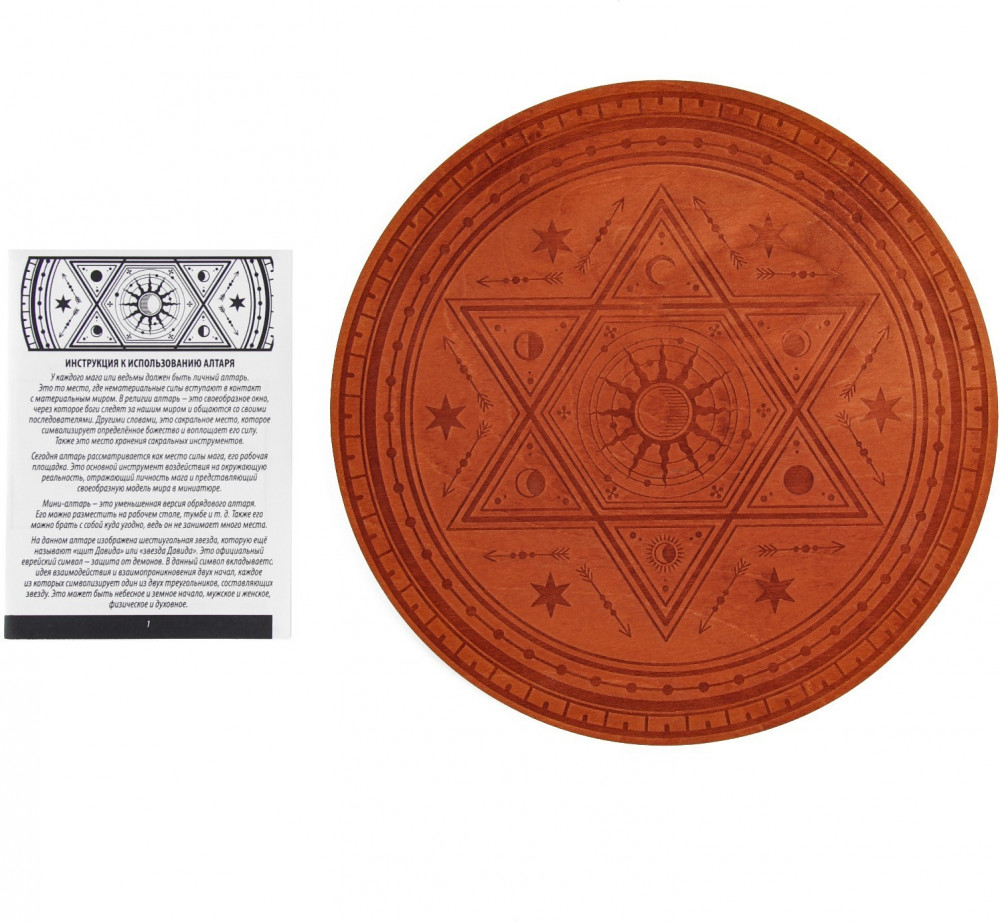 💳 Оплатить за товар можно при получении 🇰🇿 Есть бесплатная доставка по Казахстану от 1 дня 🎁 Копите бонусы с каждой покупки Серия: Гадания У каждого мага или ведьмы должен быть личный алтарь, его рабочая площадка. Это то место, где нематериальные силы вступают в контакт с материальным миром. На данном алтаре изображена шестиугольная звезда, которую ещё называют «щит Давида» или «звезда Давида». Это символ защиты. В данный символ вкладывается идея взаимодействия и взаимопроникновения двух начал, каждое из которых символизирует один из двух треугольников, составляющих звезду. Это может быть небесное и земное начало, мужское и женское, физическое и духовное. |