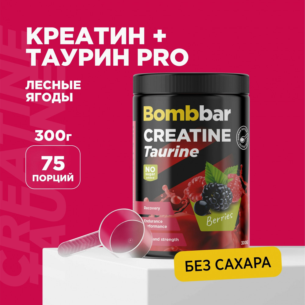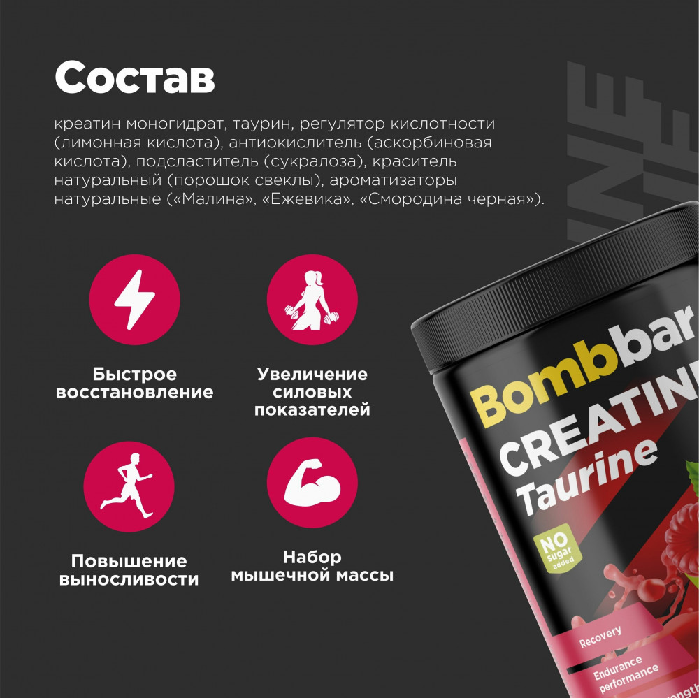 Также в коктейле содержится таурин, который повышает чувствительность к инсулину и стимулирует его синтез. Помимо этого, таурин обладает мягким желчегонным действием, улучшает метаболические процессы в печени, сердце и других органах, применяется при сердечно-сосудистых заболеваниях. И креатин, и таурин снижают уровень сахара и холестерина в крови и уменьшают риск развития атеросклероза. Главное же свойство таурина в спортивных добавках — уменьшение посттренировочных болей, снижение процессов разрушения (катаболизма) в мышцах, поэтому он полезен для приема как до, так и после тренировки, поэтому сочетание креатина с таурином — ещё один плюс коктейля от Bombbar.