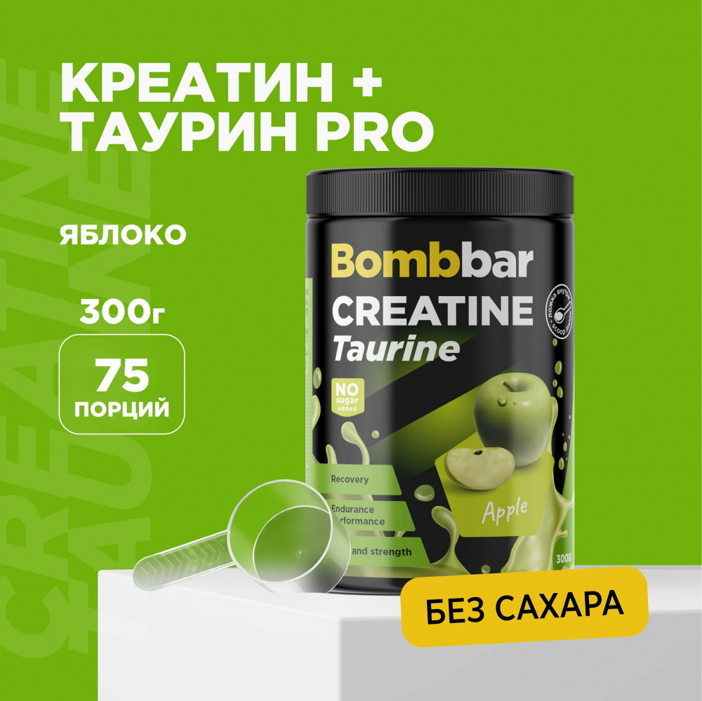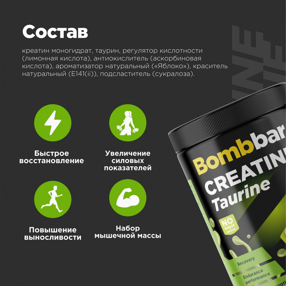 Также в коктейле содержится таурин, который повышает чувствительность к инсулину и стимулирует его синтез. Помимо этого, таурин обладает мягким желчегонным действием, улучшает метаболические процессы в печени, сердце и других органах, применяется при сердечно-сосудистых заболеваниях. И креатин, и таурин снижают уровень сахара и холестерина в крови и уменьшают риск развития атеросклероза. Главное же свойство таурина в спортивных добавках — уменьшение посттренировочных болей, снижение процессов разрушения (катаболизма) в мышцах, поэтому он полезен для приема как до, так и после тренировки, поэтому сочетание креатина с таурином — ещё один плюс коктейля от Bombbar.