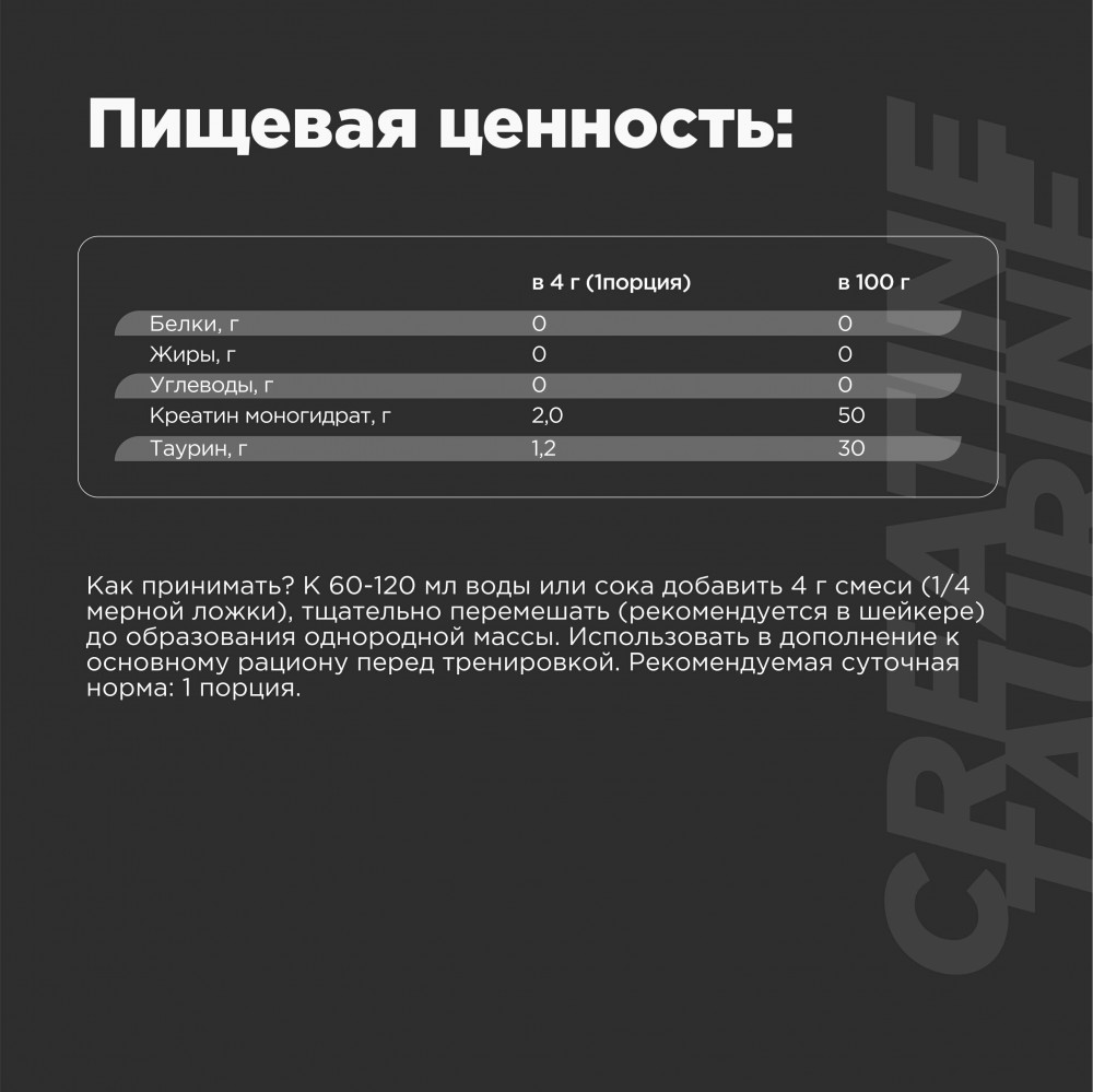 Размер порции: 4 г (1/4 мерной ложки). Креатин не является допингом и служит хорошей безопасной альтернативой различным анаболическим стероидам и гормонам роста с неприятными побочными эффектами.