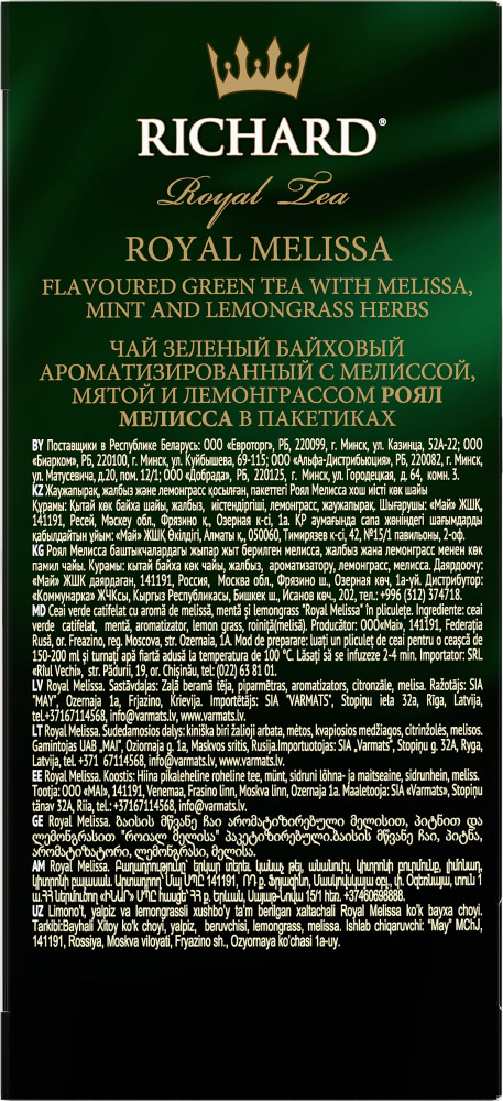 Richard Чай «Royal Melissa»В данный момент этот товар отсутствует в продаже. Возможно, у нас найдется аналогичный или похожий товар здесь. Китайский зеленый чай Richard Royal Melissa с мелиссой, мятой, лемонграссом и цедрой цитрусовых. Восхитительный микс нежного зеленого чая, ароматного лемонграсса и освежающей мелиссы наполнит легкостью и поможет восстановить внутреннюю гармонию. |