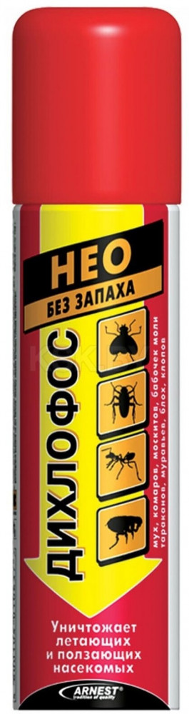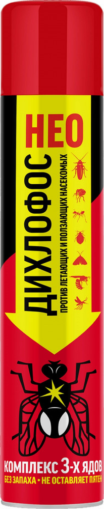 Незаменимое в домашнем хозяйстве универсальное средство для борьбы со всеми видами бытовых насекомых. Уничтожает мух, комаров, тараканов, муравьёв, бабочек моли, клопов, блох и других насекомых. Не имеет запаха. Создаёт защитный барьер на обработанных поверхностях, действующий до 2-х недель. В составе современного Дихлофоса — сочетание трёх современных действующих веществ, усиленное специальным веществом-синергистом. Не оставляет насекомым шанса выжить.
