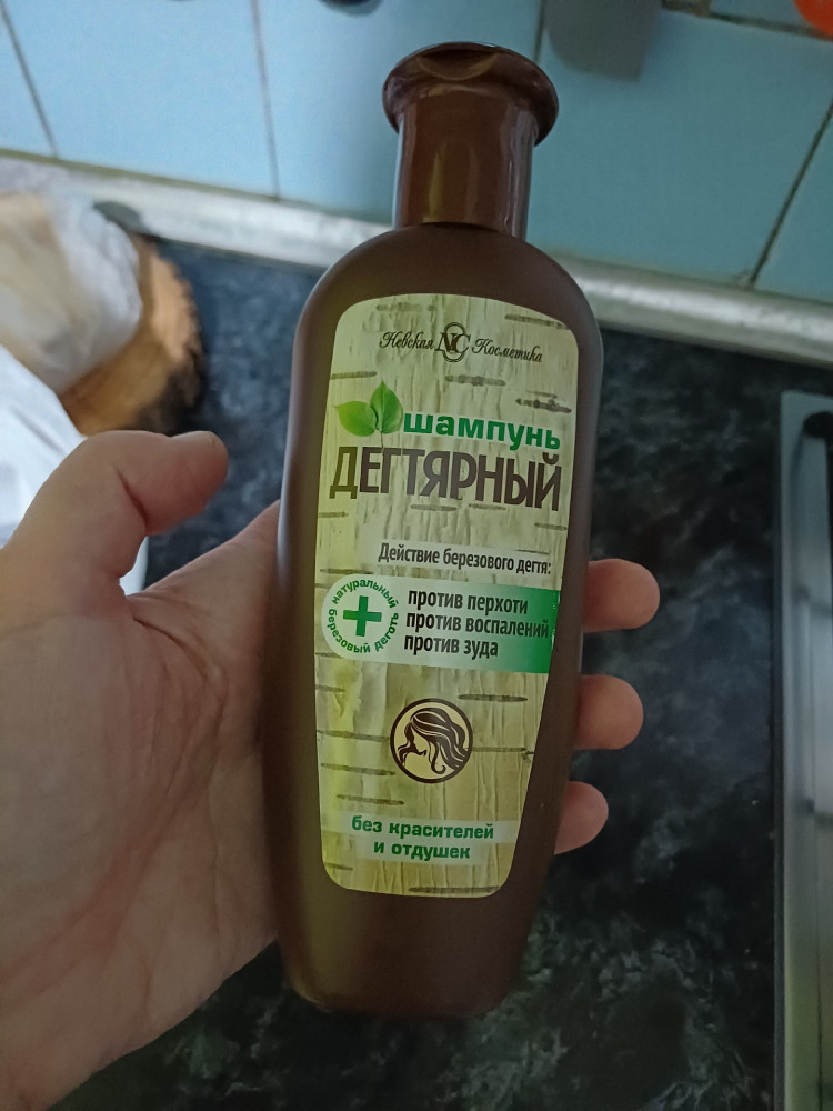 Мне нравится этот шампунь. При мытье головы лёгкий запас дёгтя. После мытья запах не чувствуется. Перхоти нет, голова не чешется. Да, и дёготь полезен для кожи.
