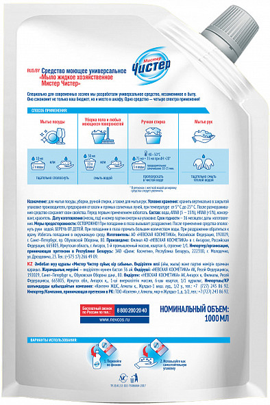 💳 Оплатить за товар можно при получении 🇰🇿 Есть бесплатная доставка по Казахстану от 1 дня 🎁 Копите бонусы с каждой покупки Жидкое хозяйственное мыло «Мистер Чистер» подходит для мытья посуды и кухонных поверхностей, для влажной уборки пола, стирки вручную всех типов тканей, а также для гигиены рук. Универсальный помощник для уборки всего дома. Подходит для мытья посуды и пола, обезжиривания моющихся поверхностей, стирки вручную всех типов тканей (в том числе и в холодной воде), а также для гигиены рук. Одно средство — 4 спектра применения! |