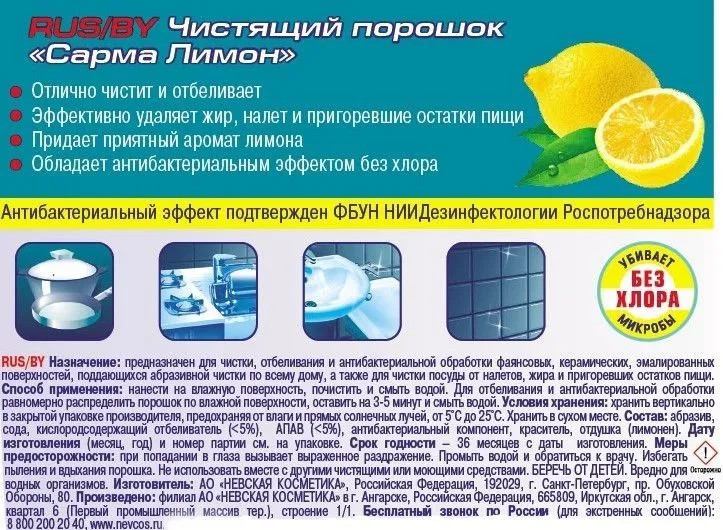 Sarma Порошок чистящий отбеливающий с антибактериальным эффектом «Лимон»