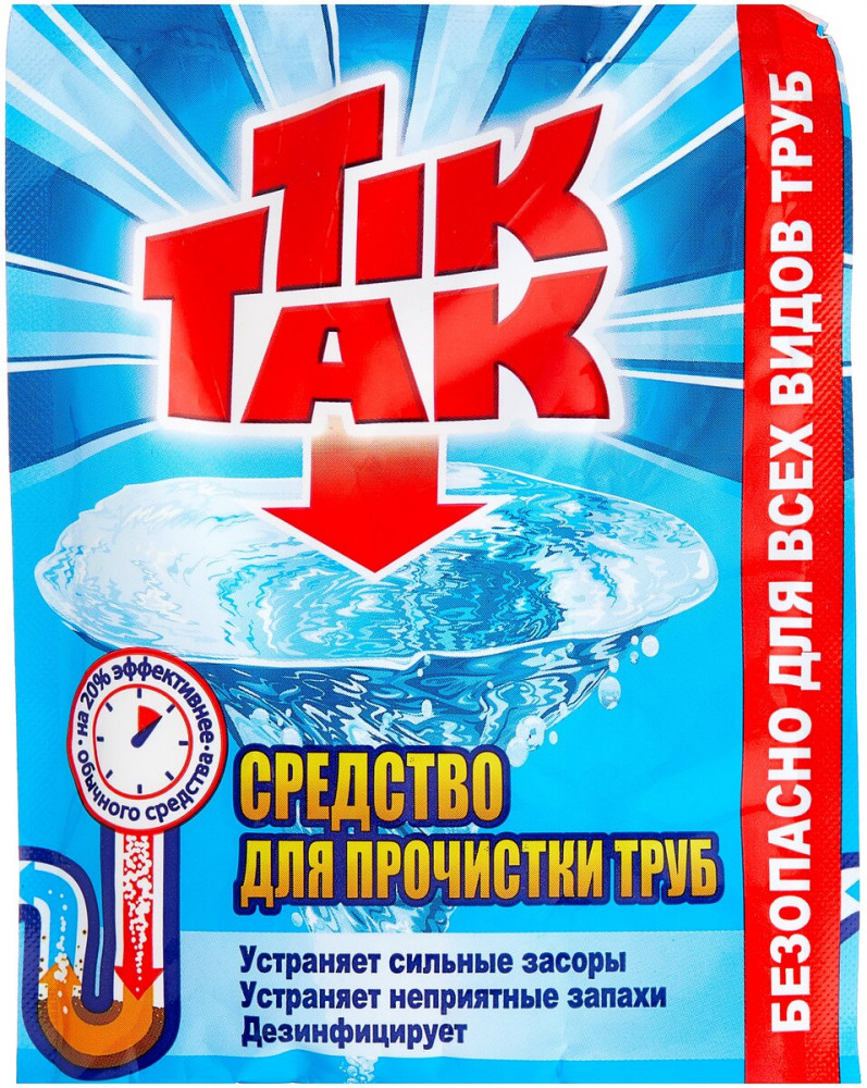 Обладает повышенными прочищающими свойствами благодаря увеличенной массе активного вещества. Полностью восстанавливает пропускную способность сливных отверстий и канализационных труб. Эффективно очищает канализационные сливы и надолго устраняет неприятные запахи из них.