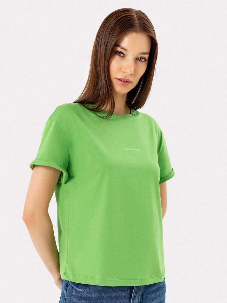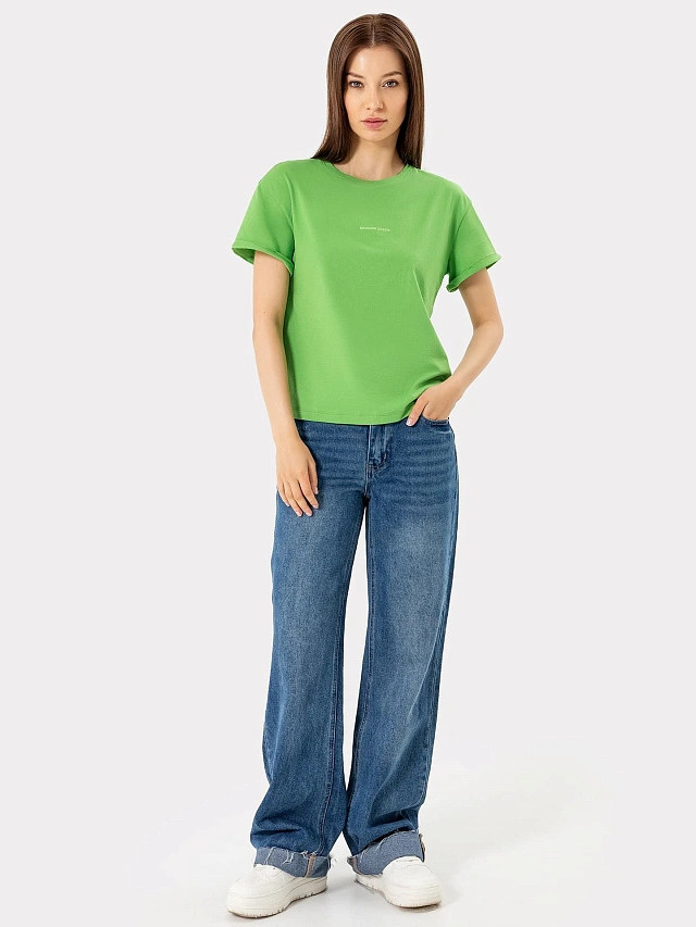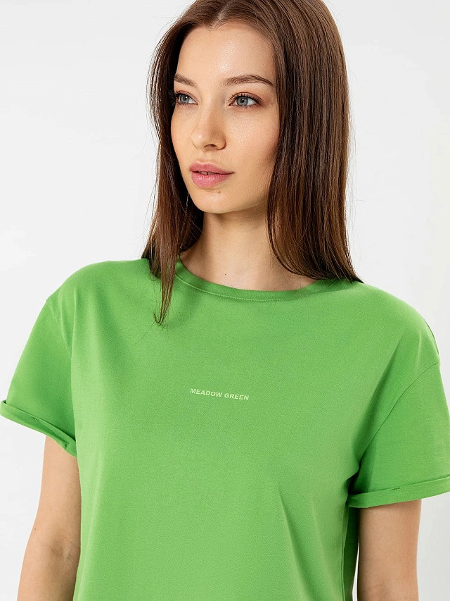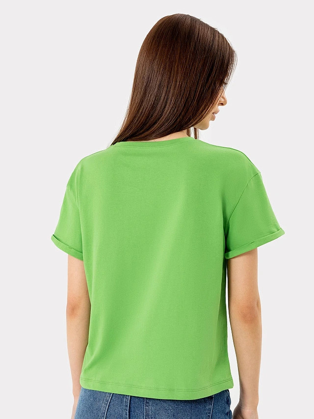 Укороченная женская футболка свободного силуэта. Линия плеча спущенная, что гарантирует свободу движений. Короткие рукава подогнуты. Футболка отлично подойдет для отдыха, прогулки, ее можно надеть на занятия спортом, фитнесом или просто под любую другую одежду. Базовый цвет позволят комбинировать футболку со множеством других вещей.