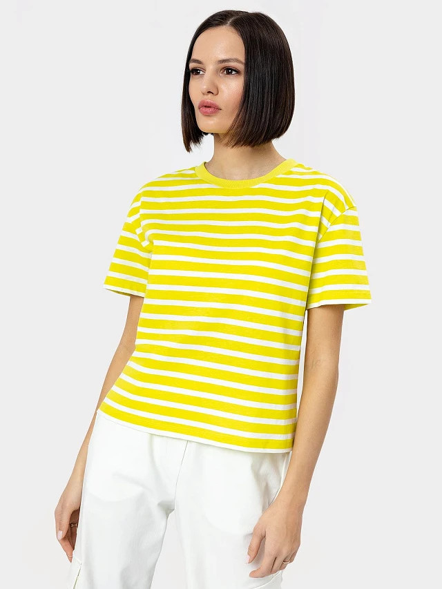 Очень хорошая футболка, полоски жёлтые яркие, ткань к телу комфортная, 💯 х/б. Купила для дочери, ей понравилась. 46-у размеру соответствует, немного свободная, не в обтяжку. После стирки не села, не полиняла. Отличное качество по невысокой цене. Пожалуй возьму на летний сезон и себе.